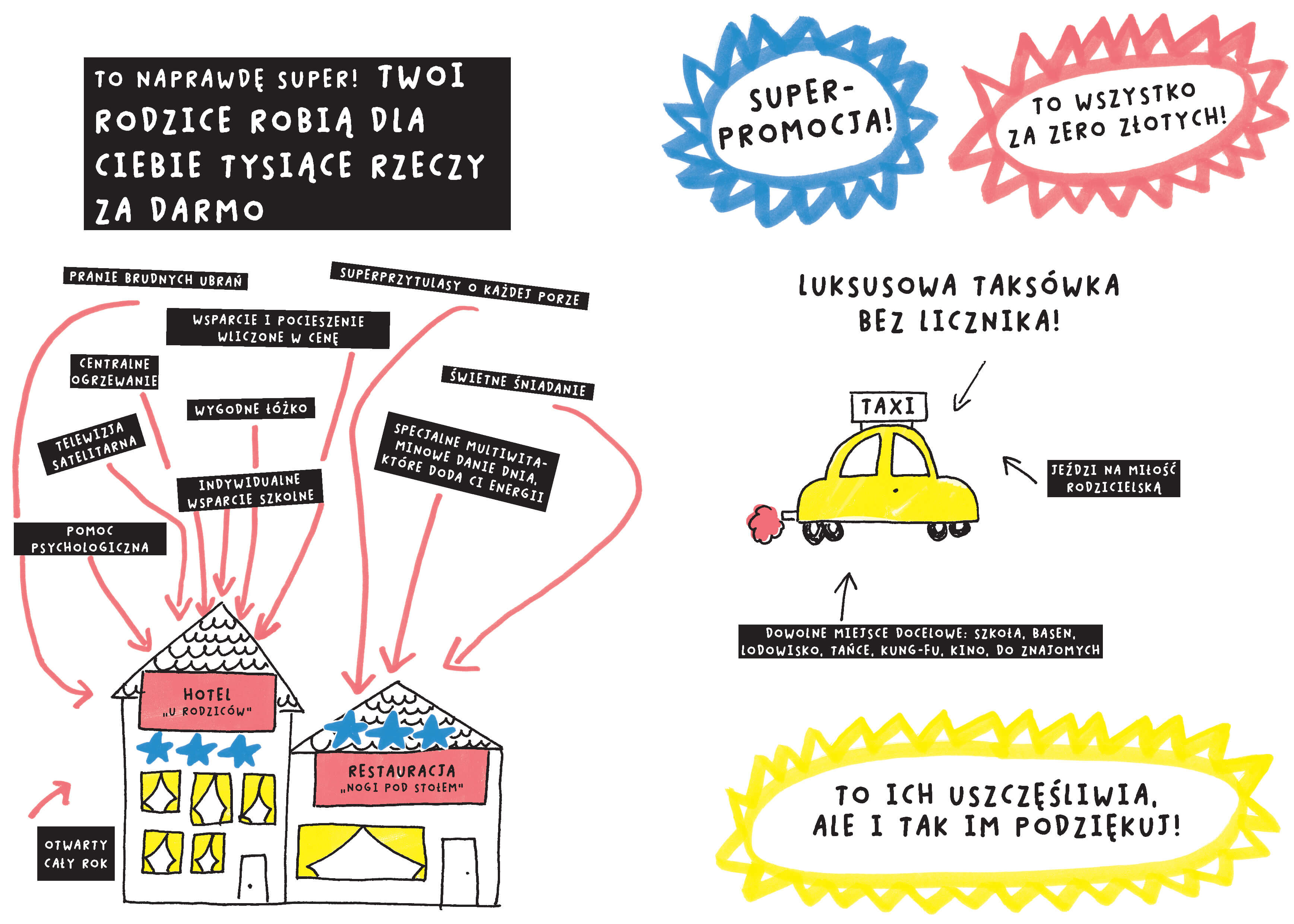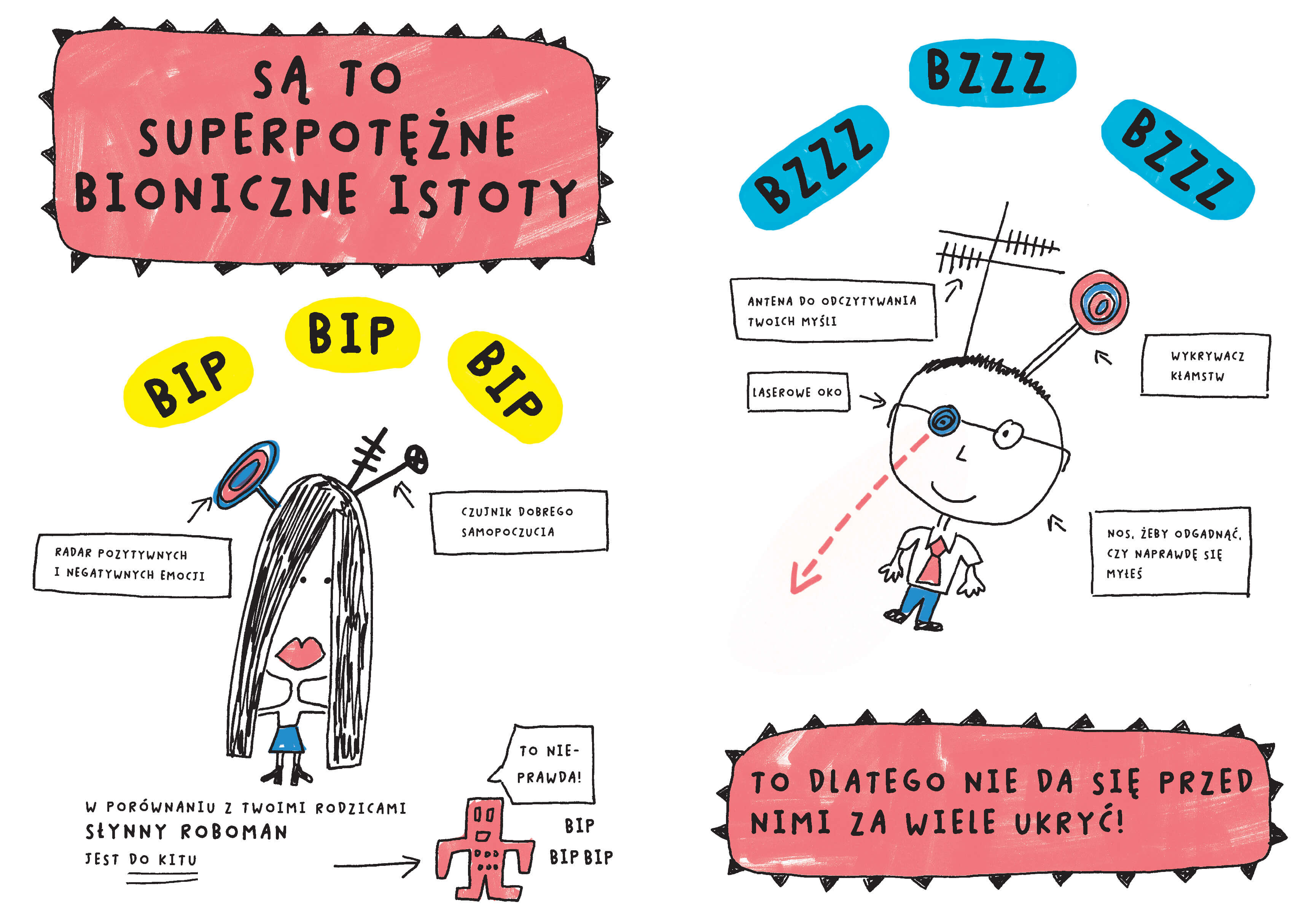 Pełna humoru i nieoczywistych rozwiązań książka dla młodszych i nieco starszych czytelniczek i czytelników, dzięki której w końcu odkryją, dlaczego rodzice są wyjątkowymi istotami; zrozumieją, że nawet jeśli czasem są wkurzający, to dla ich dobra, bo pod pozorami przeciętności, rodzice są wyjątkowymi istotami!