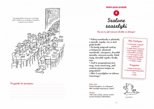 "Książka kucharska Mikołajka" autorstwa Christine de Beaupre i Beatrice Valentin to prawdziwa kulinarna przygoda dla dzieci. Ta książka jest nie tylko zbiorem przepisów, ale również wspaniałym sposobem na wspólne spędzanie czasu w rodzinie i wprowadzanie najmłodszych w świat gotowania. Przepisy w książce są inspirowane klasycznymi przygodami Mikołajka i jego przyjaciół, co dodaje tej książce wyjątkowego uroku. Od tortu czekoladowego, który można powiększyć dla Buni, po szalone szaszłyki idealne na piknik z państwem Blédurt - każdy przepis jest zabawny i pełen charakterystycznego dla Mikołajka humoru. Co ważne, przepisy są proste i przystępne. Autorki zachęcają do eksperymentowania w kuchni i wspólnego gotowania z rodzicami, co jest świetnym sposobem na naukę i rozwijanie umiejętności kulinarnych u dzieci. To też świetna okazja dla rodziców, by spędzić czas z dziećmi, ucząc ich podstawowych zasad gotowania. Ilustracje w książce są kolorowe i radosne, co dodatkowo zachęca do zabawy w kuchni. Każdy przepis jest przedstawiony w sposób, który jest atrakcyjny i łatwy do zrozumienia dla młodych kucharzy. "Książka kucharska Mikołajka" to nie tylko książka z przepisami, ale także zbiór pomysłów na wspólne rodzinne aktywności. Przygotowywanie potraw z Mikołajkiem i jego paczką to świetna zabawa, a jednocześnie okazja, by nauczyć dzieci ważnych umiejętności życiowych. Każdy przepis to mała przygoda, która kończy się smacznym podwieczorkiem.