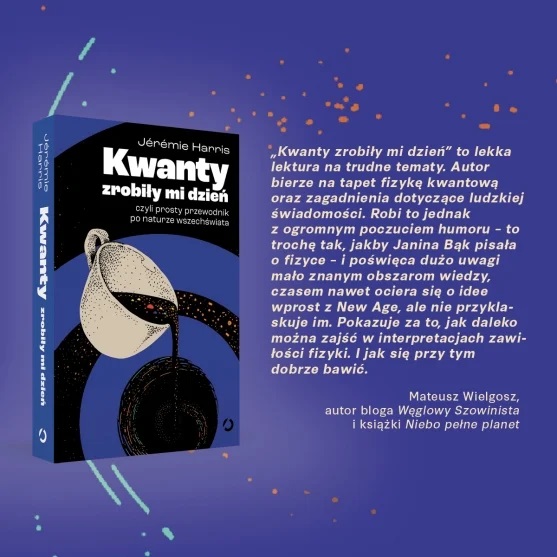 Godzina 7:00. Otwierasz oczy na dźwięk budzika. Myjesz zęby, pijesz ulubioną kawę i rozpoczynasz kolejny dzień we wszechświecie. W drodze do pracy stoisz w korku, słuchasz radia i przeglądasz telefon w poszukiwaniu nowych informacji. W tym samym czasie wokół ciebie wirują niewyobrażalne ilości cząsteczek i atomów, dokonując wyczynów przeczących zdrowemu rozsądkowi: znajdują się w wielu miejscach naraz lub poruszają się w dwóch kierunkach jednocześnie. I chociaż wydawać się to może niepojęte, to prawda jest taka, że kwanty zrobiły ci dzień! W swojej książce Jérémie Harris w przystępny i ciekawy sposób tłumaczy zawiły i fascynujący świat fizyki kwantowej. Opowiada o kotach zombie, nieśmiertelności i o tym, dlaczego twój mózg jest obiektem mechaniki kwantowej. Pokazuje, dlaczego multiświat jest większy, niż sądzimy, a nasze działania z góry ustalone. Weź kubek z ulubioną kawą i zanurz się w świecie fizyki kwantowej.
