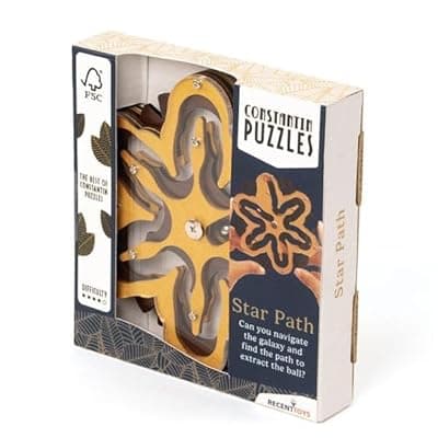 Ta wspaniała łamigłówka labiryntowa składa się z trzech różnych warstw, które poruszają się osobno. Srebrna kulka musi przejść przez cały wszechświat i na samym końcu znaleźć się na zewnątrz. Czy potrafisz poruszać się po galaktyce i znaleźć drogę do wyciągnięcia kulki?Jean Claude Constantin jest niewątpliwie jednym z najbardziej zapracowanych projektantów łamigłówek ostatnich trzydziestu lat. Wyjątkowe i różnorodne pomysły, które powstają w jego głowie, przemieniają się w unikalne i wizualnie zachwycające projekty. Łamigłówki Jean Claude'a uznawane są za bardzo wymagające. Aby je rozwiązać, będziesz potrzebował dużej aktywności szarych komórek, odpowiedniej koncentracji i odrobiny wyobraźni.Recent Toys to producent łamigłówek z Holandii. Jak sami o sobie mówią: „Tworzą zagadki dla wszystkich.” Jeżeli lubisz matematykę, logikę, układanie wzorów lub po prostu jesteś cierpliwy i wytrwały, to na pewno znajdziesz coś dla siebie! Choć wszystkie łamigłówki są unikatowe to mają one następujące cechy wspólne:1. Prostota – zagadki są łatwe do wytłumaczenia. Nasz umysł ma się skupić na rozwiązaniu łamigłówki, a nie na zrozumieniu zasad. 2. Mądrość – łamigłówki są zaprojektowane tak, aby zmusić nasz umysł do poszerzenia horyzontów i otwarcia na nowe pomysły. 3. Wytrzymałość – łamigłówki zbudowane są z odpowiednich materiałów. Elementy można przesuwać z wyjątkową łatwością. Chodzą płynnie, szybko i się nie zacinają.Podejmij wyzwanie! Popraw kondycję swojego umysłu!ZAWARTOŚĆ:łamigłówka Star Path (wymiary: 14x14x1,5 cm)książeczka