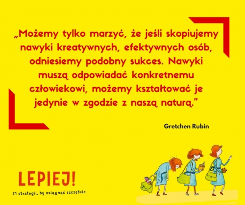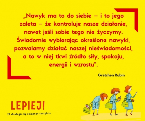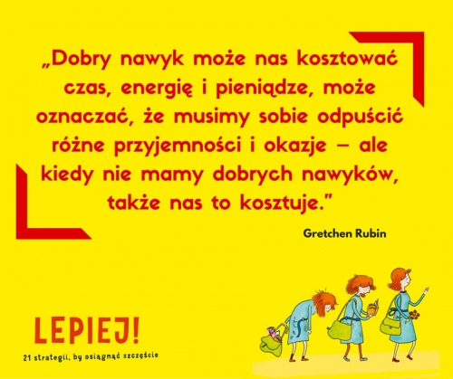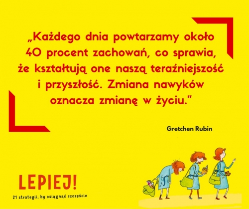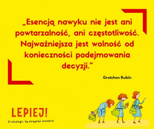 Bestseller New York Times, Washington Post i Wall Street Journal niebawem w Polsce! Chcesz spotykać bliskich, ale nie tylko na Facebooku? Chcesz regularnie biegać, ale niekoniecznie z domu do pracy? Chcesz się zdrowo odżywiać, ale to czekolada daje Ci szczęście? Zastanawiasz się, czemu nie możesz znaleźć czasu, by robić to, co kochasz? Autorka bestsellerowego Projektu szczęście daje prostą odpowiedź: z powodu nawyków. To przyzwyczajeniom zawdzięczamy zdrowie, szczęście i spełnienie, lub przeciwnie – stres i frustrację. Gretchen Rubin w żywy i dowcipny sposób pokazuje, jak naprawić swoje życie bez konieczności podejmowania trudnych decyzji i robienia czegokolwiek wbrew sobie. Ponieważ każdy z nas jest inny, proponuje 21 strategii. Poznaj wszystkie i wybierz własną drogę do szczęścia. Przypomnij sobie, co jest dla Ciebie naprawdę ważne, i zacznij znów cieszyć się życiem. Autorka pomoże Ci zrobić to prościej i skuteczniej, niż się spodziewasz. Uwaga! Strategie prezentowane w książce autorka testowała na sobie i przyjaciołach – wszystkim żyje się LEPIEJ!