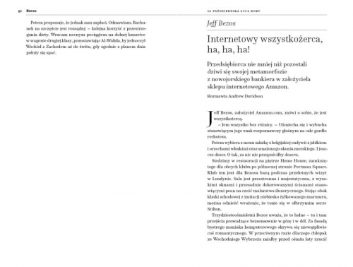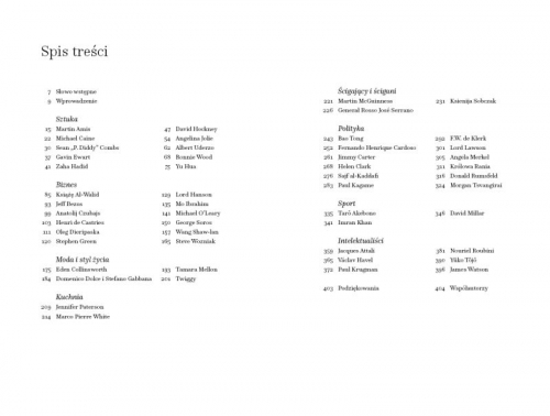 Z KIM SPOŚRÓD WSZYSTKICH LUDZI NA ŚWIECIE CHCIAŁBYŚ PÓJŚĆ NA LUNCH? Spotkaj się z największymi osobistościami ze świata sztuki, biznesu, mody, polityki i sportu. To niepowtarzalna okazja, żeby się dowiedzieć, na czym polega tajemnica ich sukcesu. • Dlaczego Jeff Bezos pracuje przy zwykłym tanim biurku? • Jak wygląda lunch w „standardzie Ryanaira” z dyrektorem generalnym Michaelem O’Learym? • Jak to możliwe, że szef największego towarzystwa ubezpieczeniowego uprawia jeden z najbardziej ekstremalnych sportów na świecie? • Jak George Soros zarobił miliard funtów w ciągu jednego dnia? • Co wspólnego z gwiazdą rocka ma Steve Wozniak? • Dlaczego Dolce i Gabbana nie sprzedają ubrań za gotówkę, a założycielka marki Jimmy Choo osobiście farbuje buty celebrytom? „Financial Times” zaprasza na Lunch z ludźmi sukcesu – gość wybiera restaurację, a wydawca reguluje rachunek. Rozmówcy rozluźniają się przy obiedzie i butelce wina, pozwalając sobie na otwartość, autentyczność, a nawet niedyskrecję. Jakie sekrety zdradzili? Którą restaurację wybrali? Co zamówili? Wszystko jest jawne. Poznaj wielkie nazwiska od bardziej osobistej strony i zainspiruj się historią ich sukcesu. KULTOWA RUBRYKA PO RAZ PIERWSZY PO POLSKU