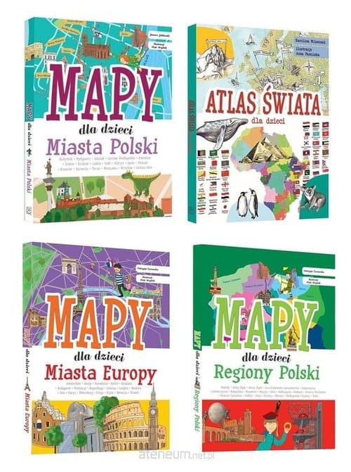 Regiony Polski Książka zawiera opisy wartych odwiedzenia regionów Polski. Opisane atrakcje i ciekawe miejsca zaznaczone są na mapach. Wybierz się w podróż na Mazury, Mazowsze lub w Tatry. Miasta Europy Książka zawiera opisy najbardziej malowniczych miast Europy. Opisane atrakcje i ciekawe miejsca zaznaczone są na mapach. Wybierz się na wycieczkę do Paryża, Barcelony czy Rzymu. Miasta Polski Książka zawiera opisy 18 najważniejszych miast Polski, będących stolicami lub głównymi miastami województw. Opisane atrakcje i ciekawe miejsca zaznaczone są na mapach Atlas świata Atlas świata dla dzieci Książka zawiera podzielone tematycznie opisy wszystkich kontynentów. Znajdziesz tu rozdziały o państwach świata, geografii, roślinach, zwierzętach, architekturze, ludziach, kuchni i sporcie. Opisane atrakcje i ciekawe miejsca są pięknie zilustrowane i zaznaczone są na mapach.