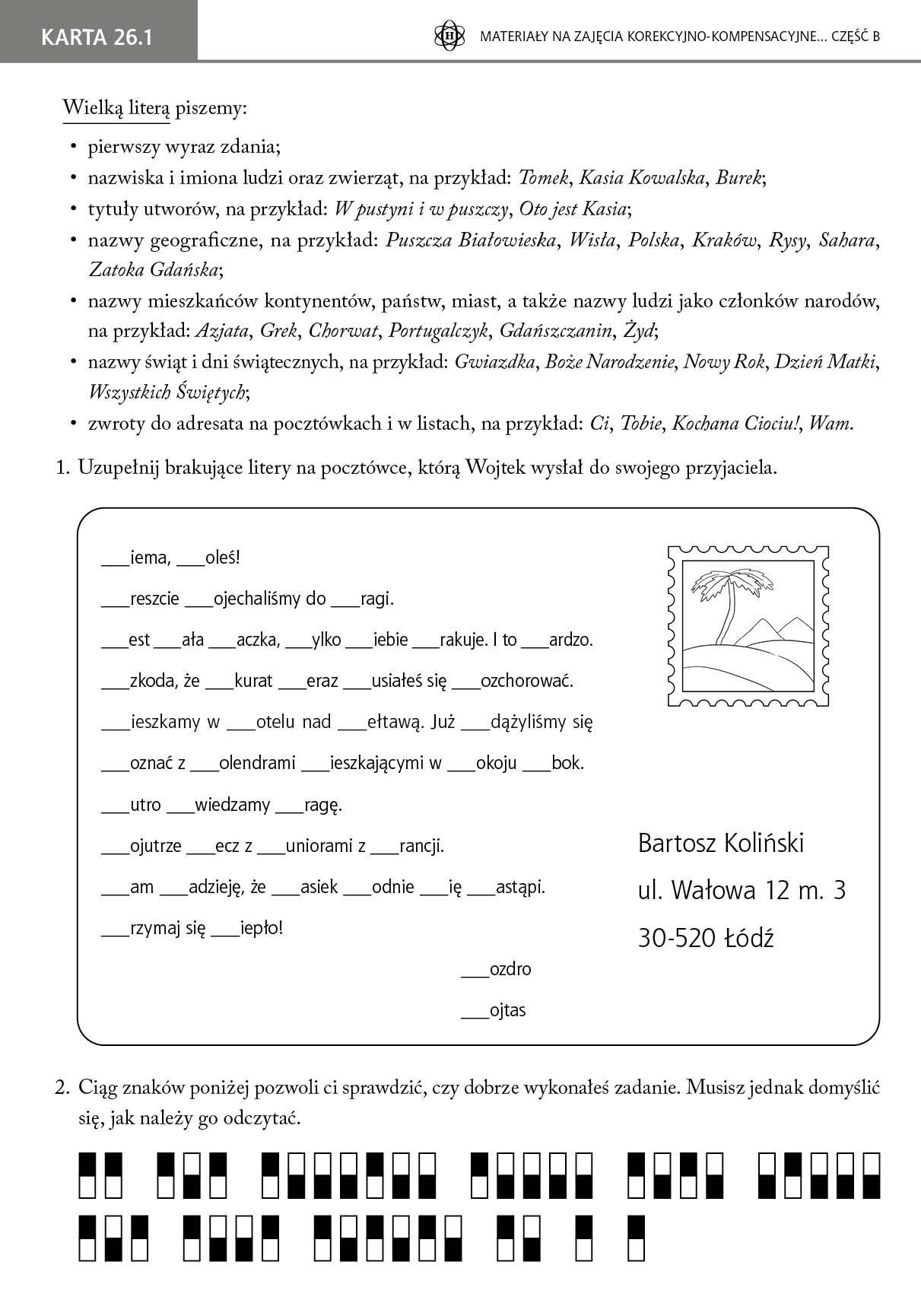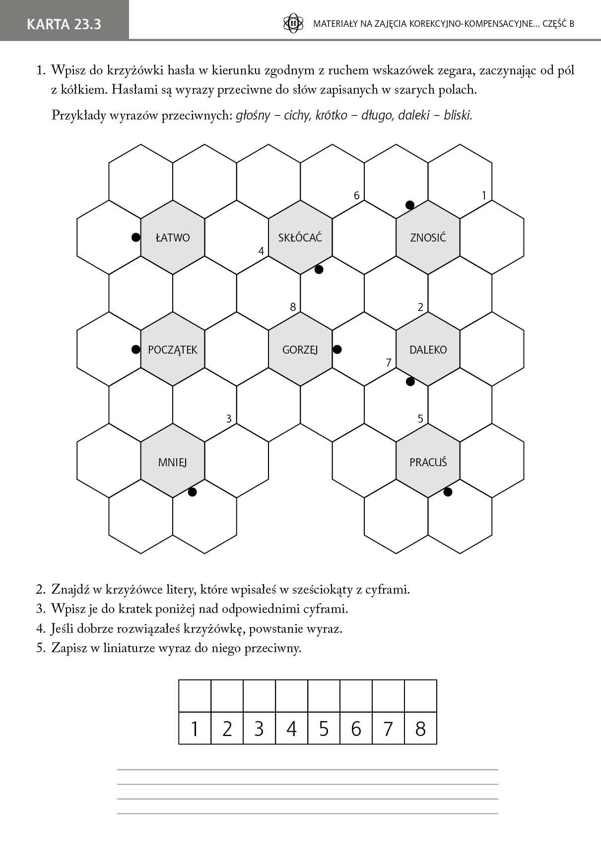 Prezentowane karty pracy mają służyć doskonaleniu umiejętności czytania i pisania przez uczniów zarówno podczas zajęć korekcyjno-kompensacyjnych, jak i w trakcie regularnych zajęć lekcyjnych. Zawierają liczne zadania językowe, w tym ortograficzne i gramatyczne. Szereg kart ma na celu kształtowanie u uczniów umiejętności czytania ze zrozumieniem. Materiały są realizacją podstawy programowej edukacji polonistycznej wczesnoszkolnego poziomu nauczania (klasy I–III). Zawierają również ćwiczenia związane z edukacją społeczną, przyrodniczą, techniczną i informatyczną. Każda karta pracy występuje w 5 wariantach. Liczba ta wynika z tego, że grupa podczas zajęć korekcyjno-kompensacyjnych może liczyć maksymalnie 5 uczniów. W związku z tym wszyscy uczestnicy zajęć będą mogli pracować na indywidualnych kartach – takich samych pod względem formy, ale treściowo odmiennych. Stwarza to szereg dodatkowych możliwości, takich jak dobór karty pod względem stopnia trudności czy powtórzenie przez ucznia konkretnego ćwiczenia na innej treściowo karcie. Ma to również zastosowanie podczas wykorzystywania kart w trakcie regularnych zajęć lekcyjnych. Ta część została połączona z tematyką dotyczącą między innymi: rozpoznawania wyrazów o znaczeniu przeciwnym, wyrazów pokrewnych i bliskoznacznych porządkowania wyrazów w kolejności alfabetycznej stosowania poprawnej wielkości liter rozpoznawania zdań oznajmujących, pytających i rozkazujących przekształcania zdań oznajmujących w pytania i odwrotnie poprawnego stosowania znaków interpunkcyjnych pisania krótkich tekstów i przekształcania ich układania i zapisywania krótkich opowiadań.