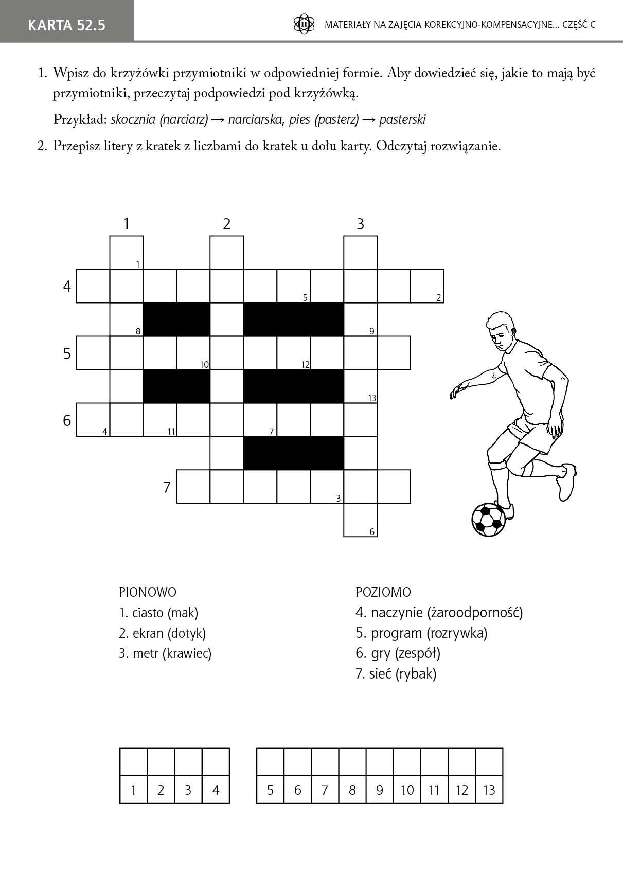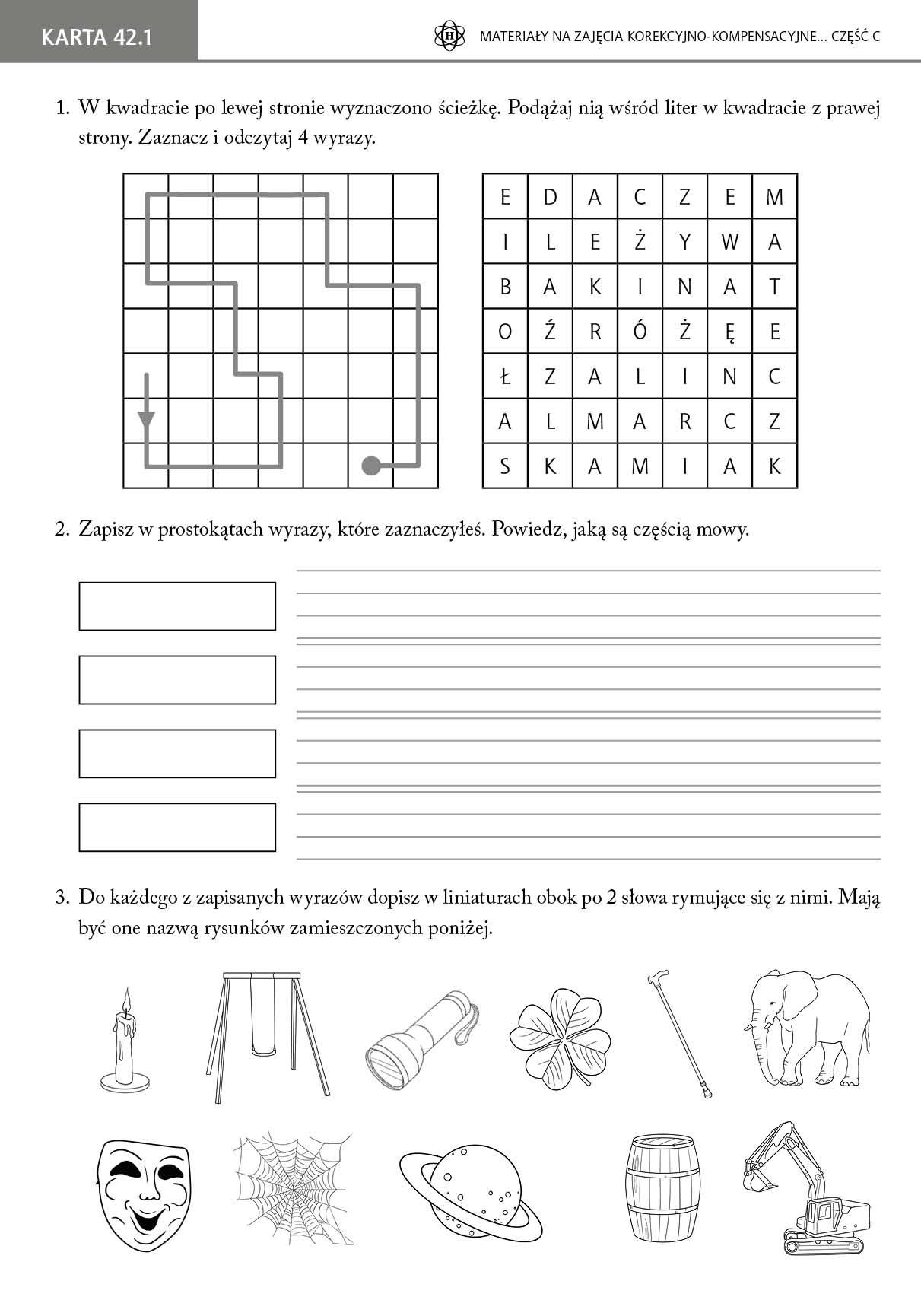 Prezentowane karty pracy mają służyć doskonaleniu umiejętności czytania i pisania przez uczniów zarówno podczas zajęć korekcyjno-kompensacyjnych, jak i w trakcie regularnych zajęć lekcyjnych. Zawierają liczne zadania językowe, w tym ortograficzne i gramatyczne. Szereg kart ma na celu kształtowanie u uczniów umiejętności czytania ze zrozumieniem. Materiały są realizacją podstawy programowej edukacji polonistycznej wczesnoszkolnego poziomu nauczania (klasy I–III). Zawierają również ćwiczenia związane z edukacją społeczną, przyrodniczą, techniczną i informatyczną. Każda karta pracy występuje w 5 wariantach. Liczba ta wynika z tego, że grupa podczas zajęć korekcyjno-kompensacyjnych może liczyć maksymalnie 5 uczniów. W związku z tym wszyscy uczestnicy zajęć będą mogli pracować na indywidualnych kartach – takich samych pod względem formy, ale treściowo odmiennych. Stwarza to szereg dodatkowych możliwości, takich jak dobór karty pod względem stopnia trudności czy powtórzenie przez ucznia konkretnego ćwiczenia na innej treściowo karcie. Ma to również zastosowanie podczas wykorzystywania kart w trakcie regularnych zajęć lekcyjnych. W tej części znajdują się ćwiczenia doskonalące między innymi umiejętności: rozróżniania rzeczowników, czasowników i przymiotników oraz stosowania ich w poprawnej formie stosowania liczebników w poprawnej formie tworzenia opisu wybranej postaci wyróżniania w tekście dialog rozpoznawania i trafnego stosowania związków frazeologicznych.