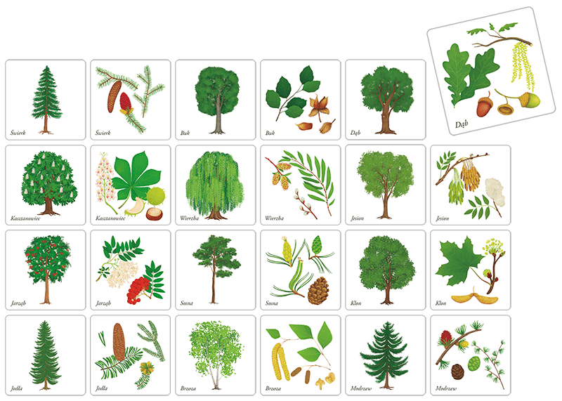 Sosna, jodła, dąb, brzoza to tylko kilka z rodzajów drzew występujących w Polsce. Czy znasz i wiesz, jak wyglądają drzewa oraz ich liście, kwiaty i owoce? Czy potrafisz je rozpoznać na spacerze w parku lub lesie? Ćwicz swoją pamięć i poznaj świat naszej niesamowitej i różnorodnej przyrody!
