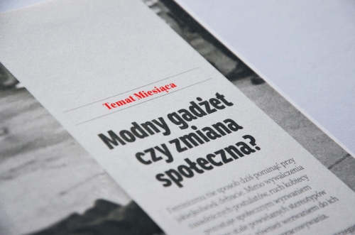Feminizm - modny gadżet czy zmiana społeczna? Temat miesiąca: Feminizm jest nie tylko dla kobiet Eva Illouz w rozmowie z Mateuszem Burzykiem Puszczalskie, brzydkie i samolubne Karolina Sulej Sukienka, która (nie) straszy Maciej Duda w rozmowie z Moniką Świerkosz Szalona głowa, złote serce Eliza Szybowicz Ponadto w numerze m.in.: Kosmogonia - drugi odcinek Mitologii wielkiej płyty Wita Szostaka Michał Lubina o powyborczych scenariuszach dla Birmy Esej Paula Blooma Przeciw empatii Neuroteologie: Czy biologia pozbawiała nas wolnej woli? Rozmawiają ks. Grzegorz Strzelczyk i Jerzy Vetulani Stacja: Literatura: Homo faber w spelunie Łukasza Orbitowskiego Gra, czyli świat - Tomasz Z. Majkowski o kreowaniu rzeczywistości w grach komputerowych Andrzej Muszyński przedstawia sylwetkę Mieczysława Szczuki