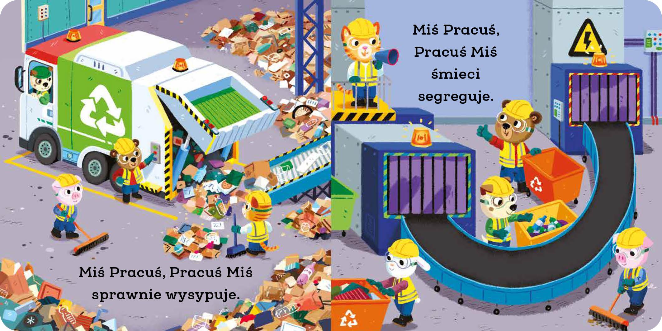 Miś Pracuś ma przed sobą kolejne ekscytujące zadanie – tym razem jeździ śmieciarką i zajmuje się segregowaniem śmieci. Poznaj jego przygody w punkcie recyklingu i zobacz, jak wygląda praca w takim miejscu. To idealna książka dla każdego miłośnika pojazdów.