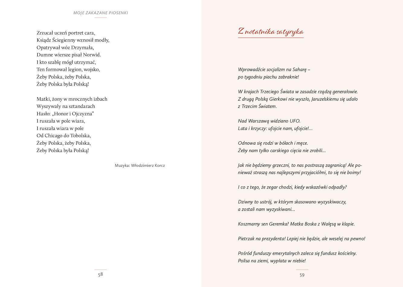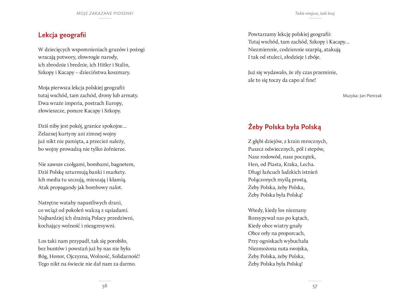 Prezentowane tu utwory nigdy jeszcze nie ukazały się w formie książkowej, choć niektóre z nich są szeroko znane w Polsce, a nawet w świecie, jak np. „Żeby Polska była Polską”.