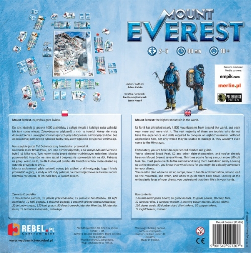 Wprowadź turystów na najwyższą górę świata Tak, spodziewałeś się, że z tym turystą będzie problem, ale powinien dać radę dotrwać do szczytu. Gorzej z tym za nim, który już słania się na nogach. Chyba będzie musiał przeczekać w namiocie. I gdzie jest Twój partner? Miał już dawno się pojawić z butlami tlenu. Bez nich żaden z tych nowicjuszy nie przetrwa nadchodzącej nawałnicy. Czeka Was ciężka noc na stoku Mount Everestu. Zresztą nie tylko Was... w dole widzisz kolejną wycieczkę, a powyżej jeszcze jedną. Nie ma to jak turystyczny sezon... W grze Mount Everest wchodzisz właściwie w interes turystyczny, ale nie jest to taki zwyczajny biznes. Tutaj giną ludzie. Na tę najwyższą górę świata weszło już prawie 4000 osób, ale zginęło ponad 200. Jednego dnia weszło 150 osób. Zdecydowana większość osób chcacych zdobyć szczyt ME to turyści, którzy nie mają doświadczenia i umiejętności wymaganych przy zdobywaniu ośmiotysięczników. Bez odpowiedniej pomocy nigdy nie dadzą rady. Na szczęście jesteś Ty! Doświadczony himalaista i przewodnik. Na koncie masz już Broad Peak, K2 i inne ośmiotysięczniki, a na samym Mount Evereście byłeś już kilka razy. Dobrze wiesz, że to, co dla Ciebie jest proste, dla Twoich klientów może być ostatnią przygodą w życiu. Musisz zaplanować gdzie ustawić obozy, jak zadbać o aklimatyzację, kogo i kiedy prowadzić na górę, a kiedy w dół, bo każdy z nich chce nie tylko zdobyć Mount Everest, ale też bezpiecznie wrócić do domu, ze zdjęciami. Nawet idąc w grupie, walczysz sam. Uwaga: planszę z gry Mount Everest można użyć w grze K2, stosując zasady K2. Zawiera ona znaczniki nie używane w grze Mount Everest, ale konieczne przy K2. Liczba graczy: 2-5 osób Wiek: od 10 lat Czas gry: ok. 90 min Zawartość pudełka: 1 dwustronna plansza 10 plansz graczy w 5 kolorach 12 kafli pogody 120 kart, po 24 w 5 kolorach 10 kafli namiotów, po 2 w 5 kolorach 12 żetonów lodospadu 30 żetonów tlenu 20 żetonów ryzyka 80 dwustronnych żetonów turystów 15 drewnianych pionków himalaistów (przewodników), po 3 w każdym kolorze 1 drewniany znacznik pogody instrukcja