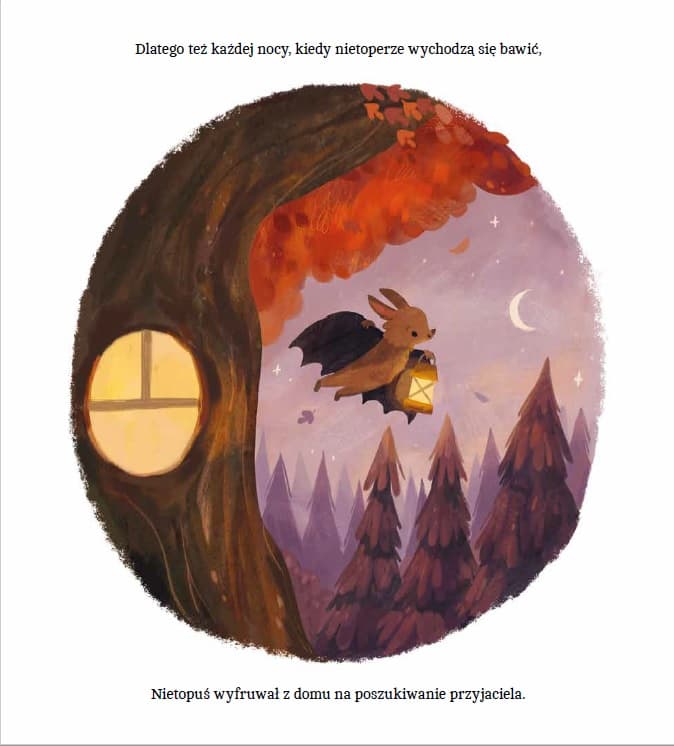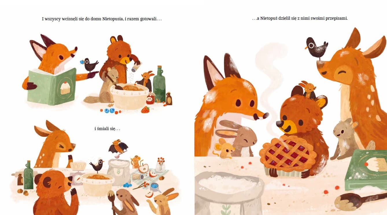Pełna ciepła, wzruszająca i zabawna książka o poszukiwaniu przyjaźni i przezwyciężaniu lęku przed nieznanym. Nietopuś bardzo pragnie mieć przyjaciół, ale wszyscy się go boją! Kiedy widzą jego cień przelatujący za oknem, są przerażeni i myślą, że to jakiś potwór. Samotny i smutny Nietopuś piecze przepyszne ciasteczka dla gości, którzy nigdy nie przychodzą. Aż pewnego dnia mała Misia wyrusza sama do lasu i o zmroku dociera do jego domu… Czy Nietopuś zdoła zachęcić inne zwierzęta, by go poznały i przekonały się, że wcale nie muszą się go bać? Podnoszący na duchu mądrym przesłaniem debiut olśniewa nastrojowymi ilustracjami w ciepłych barwach jesieni i zapachami smakowitych ciasteczek. • Rozczulająca, ale i zabawna książka o poszukiwaniu przyjaźni. • Zachęta do przełamywania lęków i uprzedzeń zrodzonych w wyobraźni i utrwalanych w grupie.