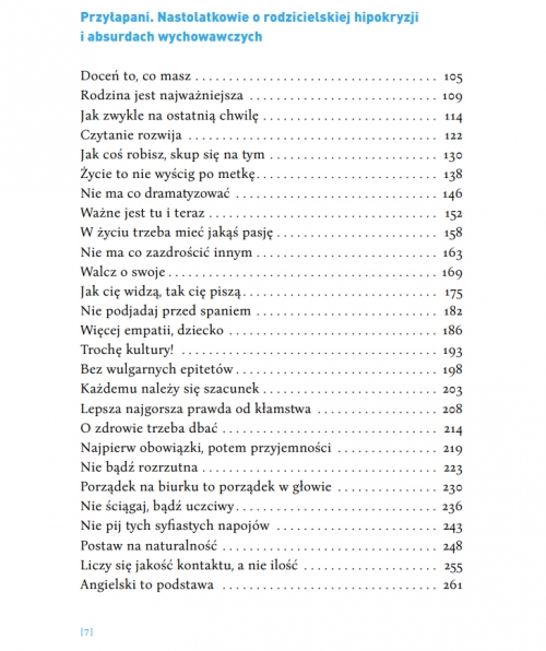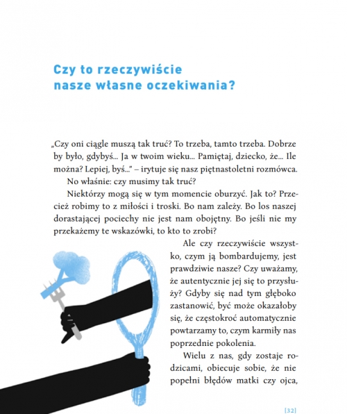 Książkę przeczytałam już jakiś czas temu, ale nie wiedziałam jak mam się zabrać do recenzji. Bo niby temat prosty, ale patrząc z perspektywy własnego życia i tego pokazanego w poradniku, to jakby powiedziała to moja babcia- Prawda w oczy kole. Bo tak naprawdę określenie bycia dorosłym można podzielić na dwa schematy: w jednym jesteśmy dorośli i to nijak ma się z rozsądkiem, tylko liczbą na karku. Tutaj dzieci się zwyczajnie przytrafiły, ślub się odbył, bo tak wypadało i daleko w takim związku do czułości, miłości, czy rozwagi w postępowaniu. Żyje się każdego dnia popełniając te same błędy, a dzieci, nasi obserwatorzy, skoro widzą, że dorośli łamią zasady, kłamią, nawet nadużywają alkoholu, to myślą, że tak trzeba. I gdzie tu określenie na bycie dorosłym? Druga partia to ci, którzy są ze sobą z miłości, zaplanowali rodzinę, chcą kształtować swoich dzieci i pokazać im, że świat może być piękny, tylko wpierw muszą pokochać siebie. Będąc tutaj dorosłym dajemy im dobry przykład i tłumaczymy co jest dobre, a co nie. Potykając się po drodze, tłumaczymy, że czasami zdarzają nam się wpadki, ale zawsze można je naprawić. Dzieci uczone takiego postępowania będą o wiele rozsądniejsze niż ci z pierwszej grupy. Zawsze można być również tym pomiędzy:-) Autorki z książki skupiły się na problemie dotyczącym niespójności w naszym zachowaniu. Dzieci nas obserwują, bo to my od początku je wychowujemy. Jesteśmy dla nich przykładem, dlatego to nasze zachowanie poddają osądowi. Co jeśli jednak my sami nie pozwalamy im na różne rzeczy, a sami po kryjomu je robimy? No, bo dziecko przed obiadem nie może zjeść słodyczy, ale my już tak? Czym zatem się od nich różnimy? Czy to jest przykład, który powinniśmy im pokazać? One sprawdzają nas, gdyż zależy im na tym, by wyznawać te same wartości, co my. Autorki dają nam tutaj wskazówki co zrobić, byśmy zawsze pozostawali dla nich najważniejsi. Nie prośmy, by sprzątały swoje ubrania, podczas gdy nasze wciąż leżą na łóżku. Nie zakazujcie im używania telefonu, w dodatku wytykając im to sami w niego zaglądamy. Dajcie sobie jakieś wytyczne. Skoro nastolatki mają wcześniej kłaść się spać, to i wy tak postępujcie. Nie wymagajcie, by wyznawały wam miłość, skoro tego od was nie słyszą. Pozwalajcie im na branie udziału w różnych konkursach, nawet jeśli wam się wydaje, że sobie nie poradzą. Bo może to wy w tym momencie jesteście w błędzie i wasze dziecko do tego się nadaje. Może tak jak i wy, tak i ono ukrywa przed wami swoje talenty. Pozwalanie im na popełnianie błędów jest pierwszą rzeczą do dorosłości i rozwijania się. Przypomnijcie sobie własne dzieciństwo, jeśli było złe, to czy chcecie, by powielali wasze błędy? Autorki odpowiadają na szereg pytań i rozważań dorosłych. Znacznie rozwijają to, co wam tu napisałam. Być może nagłówki o których będzie mowa w osobnych, krótkich rozdziałach są niezbyt czytelne, o tyle sama treść wszystko wam wyjaśnia i naprowadza na właściwe postępowanie bez wytykania wam, co robicie nie tak. Pamiętajmy, że ten poradnik nie ma na celu osądzania was, tylko pokazania, że jeśli uważacie, że tak chcecie, to pokaże wam co zrobić, byście zawsze mieli dobry kontakt ze swoim dzieckiem, nie tylko w razie dorosłości. By każde sformułowania wam nakreślić, przytoczone zostają tutaj wypowiedzi różnych nastolatków, byście wy, jako rodzice zobaczyli co oni myślą na dany temat i co im się nie podoba. Często bowiem bywa, że nasze dzieci nie chcą z nami rozmawiać. To nie znaczy, że takie są, to znaczy, że zbyt wiele razy zauważali wasze nieścisłości i teraz mając własne osądy wiedzą, że nie warto z wami rozmawiać, bo i tak je nie zrozumiecie. To bolesna prawda, jednak możecie wciąż to zmienić. Chcecie wiedzieć o robicie nie tak? Pragniecie odzyskać niezobowiązujące rozmowy z waszymi nastoletnimi pociechami? Zależy wam na tym, by podczas starości ktoś przyniósł wam kubek ciepłej herbaty? Wciąż możecie sprawić, że tak się stanie. Przeczytajcie ten poradnik, bo napisany jest po ludzku, zwykłym językiem po to, by zrozumieć mógł go każdy. Tak jak dwudziestoletni rodzic jak i ten po średnim wieku. Sami odpowiedzcie sobie, czy warto. Mi ta książka bardzo się podobała, bo niektórych nieścisłości we własnym zachowaniu nie zauważałam. Nie objęłam tego ich oczami, które wciąż bacznie mnie śledzą. Dziękuję Wydawnictwu za to, że dali mi możliwość naprawienia tego, czego nie widziałam.Poradnik niby jest przeznaczony dla rodziców nastolatków, ale również dobrze każdy może go przeczytać. Każdy kto nie spodziewa się, że zostanie ojcem lub matką, ale wie, że kiedyś do tego dojdzie. Ten, kto ma dzieci dopiero w przedszkolu, bo one naprawdę szybko dojrzewają. Sama mam pięciolatkę, która często pokazuje mi, że robi to samo, co ja. Nawet ty babciu lub dziadku, może chciałbyś zacieśnić więzy ze swoimi wnukami? Może z jakiś powodów cię nie odwiedzają? Jeśli nie wiesz w czym rzecz, tym bardziej sięgnij po ten poradnik. Druk średni, ale przejrzysty, białe strony i prosta mowa. Przypomnij sobie jak sam byłeś czy byłaś młoda, młody.Cudowny podręcznik, polecam!