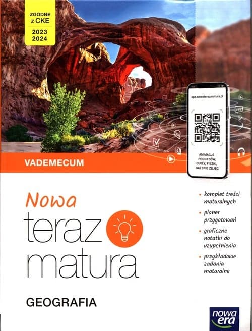 Vademecum „NOWA Teraz matura. Geografia” pozwala uporządkować i powtórzyć treści przedmiotowe oraz zapoznać się ze sposobami rozwiązywania zadań egzaminacyjnych. Realizuje wymagania egzaminacyjne CKE obowiązujące na maturze w roku 2023 i 2024. planer – plan przygotowań do matury z poręczną checklistą zagadnień przedmiotowych cała wymagana teoria w jednym miejscu i w optymalnie skondensowanej postaci dostęp do materiałów cyfrowych ułatwiających powtarzanie teorii, m.in.: fiszek, quizów, animacji procesów i galerii zdjęć graficzne notatki do uzupełnienia usprawniające proces powtarzania i zapamiętywania materiału samouczki z kluczowymi umiejętnościami geograficznymi zadania maturalne po działach, rozwiązane krok po kroku oraz do samodzielnego rozwiązania oznaczenie zagadnień najczęściej występujących na maturze rozkładana wklejka na końcu publikacji z dużymi mapami politycznymi i mapami fizycznymi świata oraz Europy NOWA Teraz matura. I wiesz jak zdać nową maturę.
