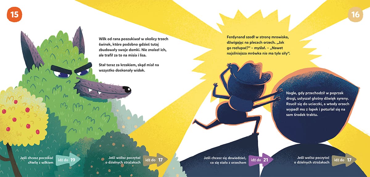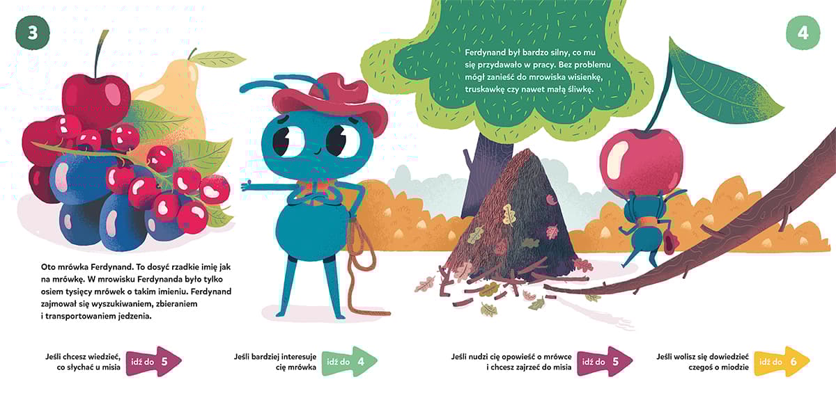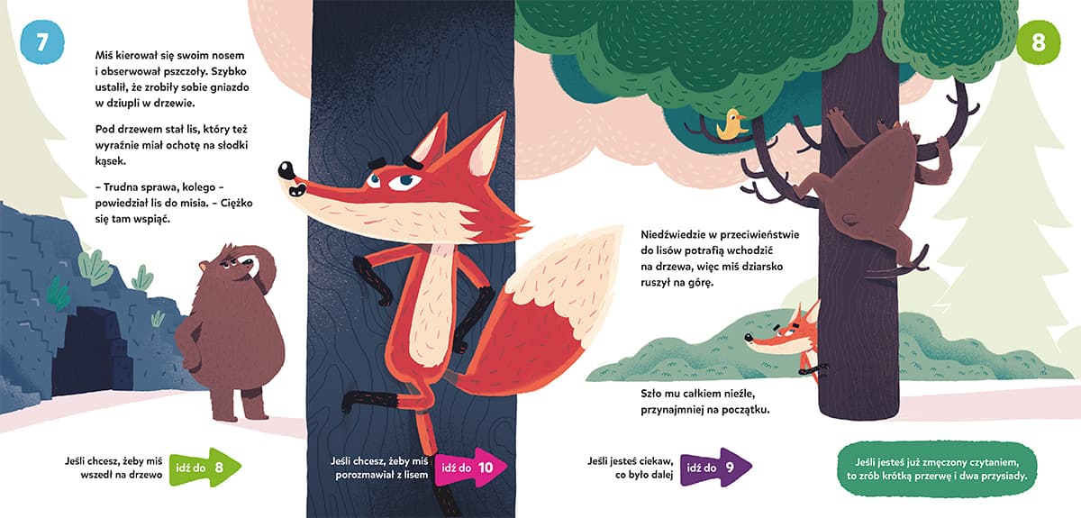 O bardzo głodnym misiu to książka-gra, bajka-wybierajka, w której to mały czytelnik decyduje, jak potoczą się losy bohaterów, kto włączy się do akcji i jak się ona zakończy. Brunatny miś budzi się głodny z zimowego snu. Postanawia posilić się miodem… Sposobów na zdobycie przysmaku nie brakuje. Można wspiąć się na drzewo, skoczyć o tyczce, skorzystać z trampoliny, a nawet wykorzystać chytry plan lisa i interwencję strażaków. A może miś zrezygnuje jednak z miodu, odwróci się na drugi bok i zapadnie w drzemkę? W tej książce nie ma rzeczy niemożliwych, a kolejność i dobór scen za każdym razem mogą być inne. Czy przy pierwszej lekturze czytelnik pozna zwyczaje mrówki Ferdynanda albo czy natknie się w krzakach na wilka, który czyha na trzy świnki? Kto wie, wszystko zależy od naszej wyobraźni. Bajkę można czytać raz krócej, raz dłużej, ciesząc się jej swobodną formą, otwartą fabułą i lekkim humorem. Świetna zabawa i dla dzieci, i dla dorosłych! Tekst bajki, inspirowany książką Raymonda Queneau Un conte á votre façon (Bajeczka na twoją modłę), napisał scenarzysta komiksowy Maciej Jasiński, a ilustracje przygotował grafik i autor komiksów Tomasz Kaczkowski.