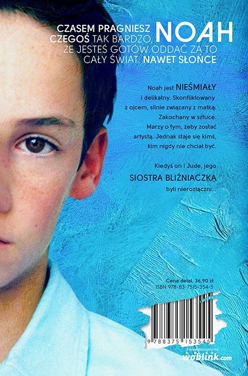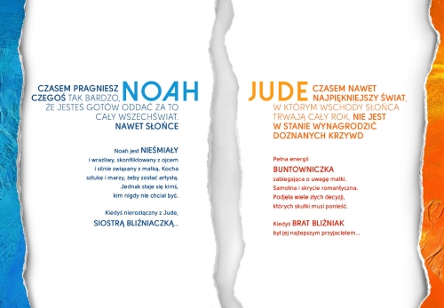 JUDE Czasem nawet najpiękniejszy świat, w którym wschody słońca trwają cały czas, nie może wynagrodzić doznanych krzywd. Pełna energii buntowniczka zabiegająca o uwagę matki. Samotna i skrycie romantyczna. Podjęła wiele złych decyzji, których skutki musi ponieść. Kiedyś brat bliźniak był jej najlepszym przyjacielem... NOAH Czasem pragniesz czegoś tak bardzo, że jesteś gotów oddać za to cały świat. Nawet słońce. Noah jest nieśmiały i delikatny. Skonfliktowany z ojcem, silnie związany z matką. Zakochany w sztuce. Marzy o tym, żeby zostać artystą. Jednak staje się kimś, kim nigdy nie chciał być. Kiedyś on i Jude, jego siostra bliźniaczka, byli nierozłączni…