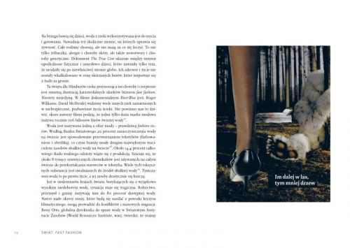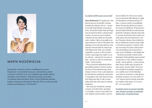 to zaproszenie do podróży śladami naszych ubrań, a także do wnętrza siebie. Na końcu tej wyprawy zrozumiesz, jak ubierać się bardziej świadomie i być fair względem siebie, innych i planety. To uwalniający przewodnik po slow fashion, który zmieni twoje myślenie o modzie i własnej szafie. Przemysł modowy jest jedną z najbardziej zanieczyszczających środowisko gałęzi gospodarki. Co sekundę na wysypisko trafia śmieciarka wypełniona ubraniami. Nikogo już nie dziwią chińskie rzeki w najmodniejszych kolorach sezonu, wysuszone jeziora, góry odzieżowych śmieci i słońce widoczne jedynie na telebimie. Szkodzi to zarówno przyrodzie, jak i milionom prawdziwych fashion victims – rolnikom, szwaczkom, dzieciom. Fast fashion dewastuje nie tylko naturę, ale i całe społeczeństwa. Cierpią nasze poczucie wartości i budżet, wypacza się relacja z ciałem i ubraniami. Możemy to jednak zmienić i nie trzeba tego robić w pokutnym worze ze zgrzebnego lnu. Modą można się cieszyć i bawić, łącząc to z misją ekologiczną i społeczną! Katarzyna Zajączkowska bacznie przygląda się przemysłowi modowemu i rozprawia z mitami na temat stylu, kanonów urody i presji social mediów. Dzięki jej prostym radom dowiesz się: – jak wykonać pierwszy krok w kierunku slow fashion i wreszcie odgruzować szafę, – jak korzystać z mody i robić zakupy odpowiedzialnie, nie dając się nabrać na greenwashing, – jak zbudować stylową i autentyczną garderobę bez pogoni za sezonowymi trendami. Nie musimy zaprzeczać, że ubrania są dla nas ważne, że chcemy wyglądać i czuć się dobrze, ale odważmy się na fashion revolution w naszych głowach i szafach! Katarzyna Zajączkowska – projektantka, wykładowczyni w Szkole Artystycznego Projektowania Ubioru, przez kilkanaście lat tworzyła kolekcje dla wiodących marek odzieżowych w Polsce. Ten świat poznała od podszewki. Zajmuje się edukacją i wspieraniem branży mody w obszarze zrównoważonego rozwoju, skupiając się na innowacyjnych rozwiązaniach wokół mody cyrkularnej. Prowadzi warsztaty świadomego budowania wizerunku dla firm, organizacji i młodzieży. Autorka bloga i podcastu „Odpowiedzialna Moda”.