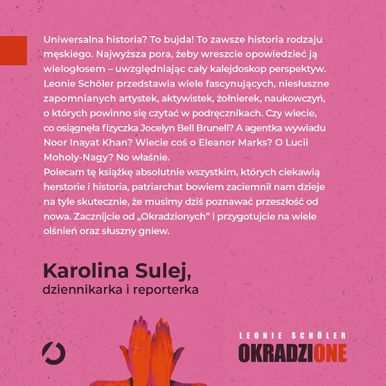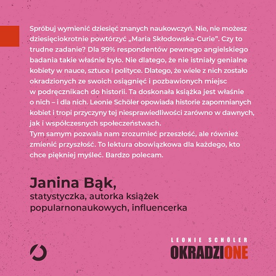 Spróbuj wymienić dziesięć znanych naukowczyń. Nie, nie możesz dziesięciokrotnie powtórzyć „Maria Skłodowska-Curie”. Czy to trudne zadanie? Dla 99% respondentów pewnego angielskiego badania takie właśnie było. Nie dlatego, że nie istniały genialne kobiety w nauce, sztuce i polityce. Dlatego, że wiele z nich zostało okradzionych ze swoich osiągnięć i pozbawionych miejsc w podręcznikach do historii. Ta doskonała książka jest właśnie o nich – i dla nich. Leonie Schöler opowiada historie zapomnianych kobiet i tropi przyczyny tej niesprawiedliwości zarówno w dawnych, jak i współczesnych społeczeństwach. Tym samym pozwala nam zrozumieć przeszłość, ale również zmienić przyszłość. To lektura obowiązkowa dla każdego, kto chce piękniej myśleć. Bardzo polecam.