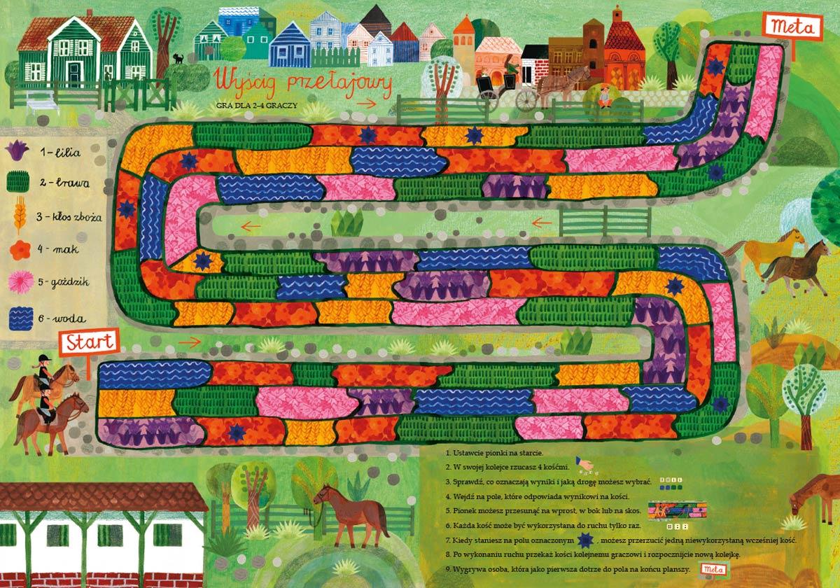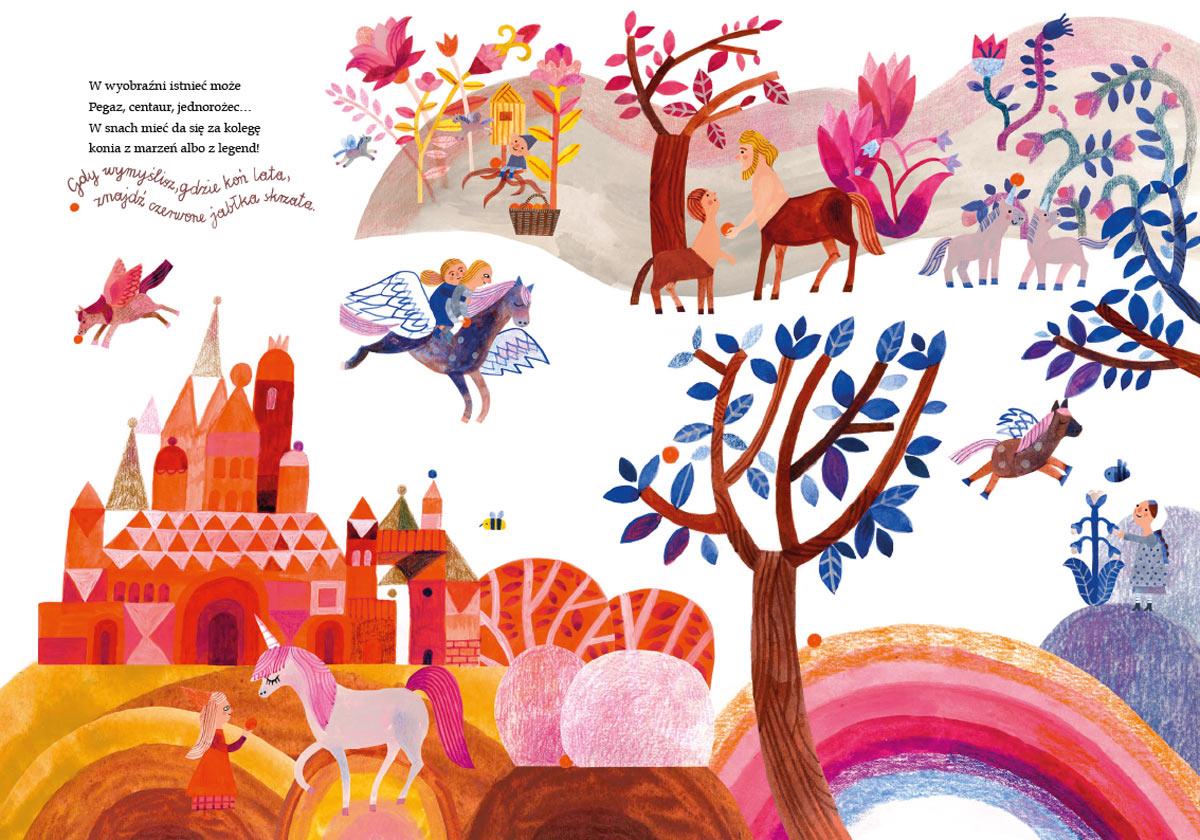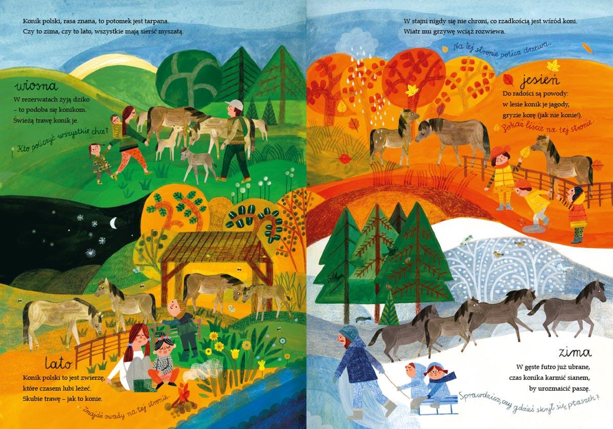 "Opowiem ci, mamo, co robią konie" to wyjątkowa pozycja dla wszystkich małych miłośniczek i miłośników tych pięknych zwierząt. Spotkacie tu konie, kucyki, koniki polskie, rzadkie zebryny oraz zebrule, a także te zupełnie wymyślone: jednorożce czy centaury. Dowiecie się, czym się różni cwał od kłusu i galopu oraz co zapleść z końskiej grzywy. Poznacie mnóstwo końskich maści: w tym szampańską, myszatą i tarantowatą. Zajrzycie też do stajni, by odkryć, w co się ubiera jeździec, jak jest skonstruowane siodło oraz co konie jedzą i jak spędzają wolny czas. Dzięki pięknym, pełnym szczegółów ilustracjom Ewy Poklewskiej-Koziełło sprawdzicie swoją spostrzegawczość, wyszukując ukryte detale i rozwiązując zagadki.Szczegółowe informacje na temat książki Opowiem ci, mamo, co robią konie