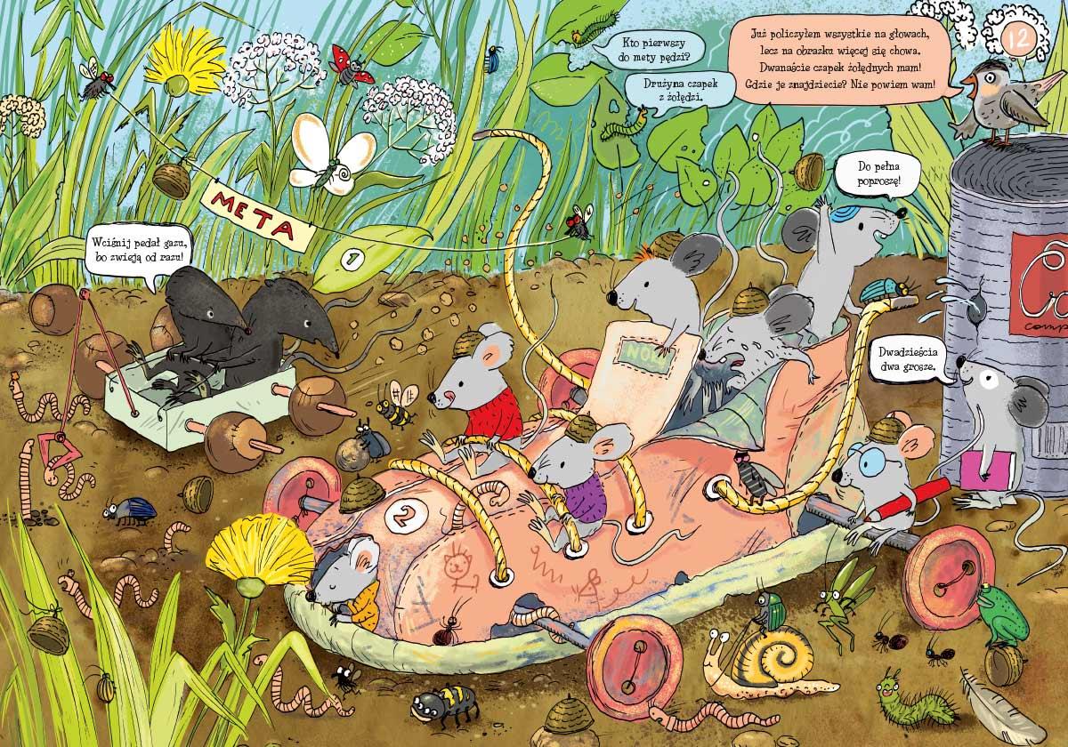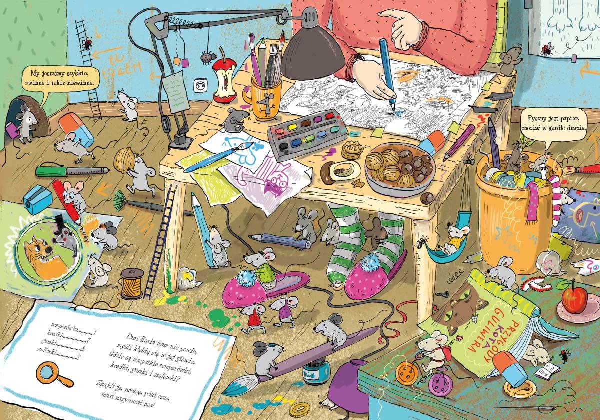Poznaj rodzinę Wąsików – Freda i Melę oraz ich liczne potomstwo. Odwiedź z nimi pracownię plastyczną, spiżarnię, mysią szkołę, a także wesołe myszeczko! Weź udział w wyścigu, spędź miło czas na koncercie i odpocznij przy ognisku. Może nawet uda ci się wyruszyć na wyprawę w kosmos i posprzątać jezioro? Przy okazji sprawdzisz swoją spostrzegawczość, wyszukując ukryte szczegóły i rozwiązując zagadki. Seria „Opowiem ci, mamo” to książki do czytania i oglądania dla dzieci w wieku od 2 do 6 lat (a nawet starszych!). Sztywne kartki, poręczny format, a przede wszystkim piękne i zabawne, pełne detali ilustracje to jej znak rozpoznawczy. Książki pomagają ćwiczyć spostrzegawczość, umiejętność opowiadania, pobudzają zainteresowanie światem, ale przede wszystkim są fantastyczną zabawą oraz sposobem na miłe i twórcze spędzenie czasu. Katarzyna Kołodziej – wrocławska ilustratorka, kucharka, mama, posiadaczka pręgowanego kota oraz królewna, która (jak każda królewna) musi być czasem porwana. Ponieważ najczęściej porywa ją rysowanie, rysuje bez przerwy. W swoich ilustracjach stara się pokazywać dziecięce emocje. Skończyła wrocławską ASP, miewa czasem wystawy, pracuje z wieloma wydawnictwami dla dzieci i jak wielka kula śniegowa nabiera rozpędu… w tworzeniu. Jej prace można obejrzeć na stronie www .krolewnakasia.plSzczegółowe informacje na temat książki Opowiem ci, mamo co robią myszy
