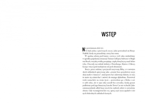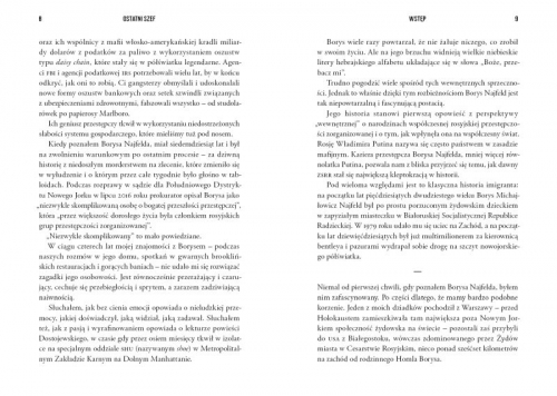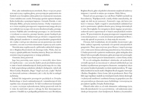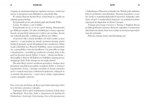 Historia ostatniego szefa prawdziwej rosyjskiej mafii w Ameryce. „Nie powinienem dziś żyć” – zaczyna swoją opowieść Borys „Biba” Nayfeld, twórca przestępczego imperium, które swoim zasięgiem obejmowało niemal cały świat. Opuszczony przez rodziców nastolatek z Homla w Związku Radzieckim trafił za chuligaństwo do kolonii karnej na Syberii. Nikt nie mógł przypuszczać, że właśnie tam zacznie się droga, która doprowadzi go do miasta największych możliwości: Nowego Jorku. A ponieważ nie miał nic do stracenia, był gotów na wszystko. Witajcie po ciemnej stronie amerykańskiego snu. Nayfeld rzucił wyzwanie zarówno FBI bezradnemu wobec jego finansowych przekrętów, jak i włoskiej mafii, która nigdy nie miała tak brutalnej i bezwzględnej konkurencji jak Rosjanie. A kiedy postanowił poszerzyć pole działania, sprzymierzył się z mafijnym bossem Ricardo Fanchinim – pierwszym gangsterem na globalną skalę, który… urodził się w Katowicach jako Marian Kozina. Dzięki tej spółce Warszawa stała się centrum przerzutu heroiny z Bangkoku do Ameryki. Ostatni szef to zaskakująca opowieść o chciwości, przemocy i zdradzie. „Fascynująca, krwawa i niesamowita historia Biby – inteligentnego, charyzmatycznego i brutalnego gangstera ze Wschodu, który wdarł się na szczyt nowojorskiego półświatka.” Filip Czerwiński, „Mafia PL” „Nie ma brutalniejszej organizacji przestępczej niż rosyjska mafia. Ta książka to wielka sprawa: zniewalająca, przypakowana, wciągająca i skazana na listy bestsellerów” agent specjalny ATF William Queen „Olśniewająca i przesiąknięta krwią biografia” „The Telegraph” „Fascynująca i wciągająca historia prawdziwego drania” „Kirkus Review”