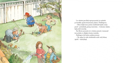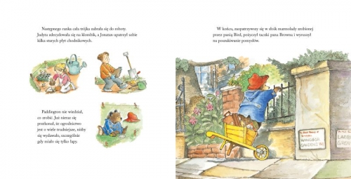 Przepięknie zilustrowane przez R.W.Alley książeczki w twardej oprawie z miękkimi stronami. Tekstu nie ma dużo i bardzo przyjemnie się go czyta. Jeśli nie znacie przygód tego misia to zdecydowanie warto sięgnąć właśnie po to wydanie.„Paddington w ogrodzie" to historia o tym jak Paddington szuka natchnienia do zaprojektowania swojego własnego kawałka ogródka u Państwa Brown. Kupuje pewną książkę, która podpowiada mu jak zaprojektować ogród. Podążając za wskazówkami autora miś idzie na budowę gdzie się wspina na rusztowanie, ale traci z oczu swój cenny słoik z marmoladą. Trochę przez to było kłopotów, ale zaowocowało to pomysłem na ogródek. Jego pomysł wygrał nawet konkurs na najładniejszy ogródek. A ocenia go sam autor zakupionej wcześniej książki.