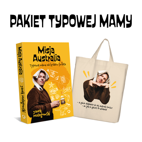 W tym wyjątkowym pakiecie znajdziesz książkę „Misja Australia. Typowa mama na krańcu świata” oraz bawełnianą torbę z autorskim nadrukiem inspirowanym kultowym humorem mr_jacy.