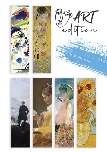 Jeszcze nigdy literatura i sztuka nie były ze sobą aż tak blisko! Specjalnie z myślą o tych, którzy są wyjątkowo czuli na piękno, stworzyliśmy unikalny pakiet zakładek ART EDITION. Składa się na niego 6 wzorów z limitowanej edycji, a każdą z nich zdobi obraz namalowany przez innego wybitnego malarza. Zobacz, jakie dzieła mogą umilić ci magiczny czas czytania: • Vincent van Gogh "Słoneczniki" ver. 3 • Oscar Claude Monet "Kobieta z parasolką" • Caspar David Friedrich "Wędrowiec nad morzem chmur" • Gustav Klimt "Pocałunek" • Wassily Kandinsky "Pierwsza akwarela abstrakcyjna" • Jean-Honoré Fragonard "Młoda dziewczyna czytająca książkę" Intensywność i wyrazistość Van Gogha, romantyzm i namiętność Klimta, czy raczej nostalgia i ulotność jak u Friedricha? To ty decydujesz, która z 6 wyjątkowych zakładek będzie ci towarzyszyła w nowej czytelniczej przygodzie. Jedno jest pewne – przerywanie lektury jeszcze nigdy nie było tak piękne! Pamiętaj, że zakładek nie sprzedajemy pojedynczo! Dzięki temu możesz na przykład podzielić się pakietem z przyjaciółmi i razem z nimi cieszyć oczy wyjątkowymi dziełami wybitnych malarzy. Ważne! Nakład pakietu ART EDITION jest mocno ograniczony! Dlatego nie zwlekaj i złóż zamówienie już dzisiaj!