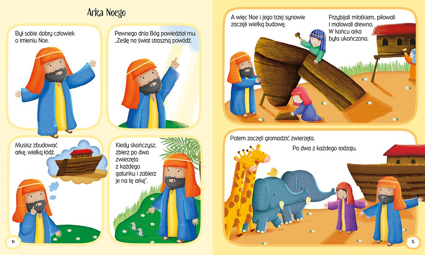 Oto cudownie kolorowe wydanie Biblii, przygotowane specjalnie z myślą o dzieciach w wieku 2 lat i nieco starszych. Idealne do wspólnego oglądania i czytania w ciągu dnia lub na dobranoc. Zawiera 18 historii biblijnych opowiedzianych prostymi słowami i przedstawionych w formie komiksu dla najmłodszych dzieci. Tekst ma odpowiednią długość i został zilustrowany w taki sposób, by zachwycić maluchy. Na końcu każdej historii dzieci są zachęcane do przypomnienia sobie usłyszanego opowiadania i przyjrzenia się ilustracjom, aby odnaleźć kilka szczegółów i odpowiedzieć na proste pytanie. W ten sposób poznają historię arki Noego, Mojżesza, Samuela, Jonasza i Daniela w jaskini lwów, a także historię narodzin Dzieciątka, przypowieść o zagubionej owcy, historie przyjaciół Pana Jezusa i wydarzenia pierwszej Wielkanocy.Szczegółowe informacje na temat książki Pierwsza Biblia dla maluszka