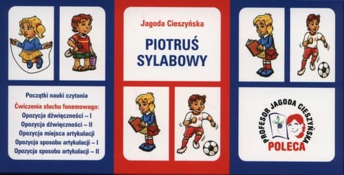PIOTRUŚ SYLABOWY gra oparta na znanych dzieciom zasadach, to: atrakcyjna propozycja ćwiczeń artykulacji dla dzieci z wadami wymowy lub niezakończonym rozwojem mowy, rozwijanie sprawności czytania sylab, ćwiczenie słuchu fonemowego, ćwiczenie koncentracji słuchowej i wzrokowej oraz skupiania uwagi dzieci nadpobudliwych, nauka podejmowania decyzji, podporządkowania się regułom społecznym. Pakiet zawiera sześć talii kart: Początki Nauki czytania, Ćwiczenia słuchu fonemowego, Opozycja dźwięczności I, Opozycja dźwięczności II, Opozycja miejsca artykulacji, Opozycja sposobu artykulacji I, Opozycja sposobu artykulacji II. Karty PIOTRUŚ SYLABOWY nawiązują do serii zeszytów logopedycznych Kocham Czytać, stanowią cenną pomoc w nauce czytania innowacyjną metodą symultaniczno-sekwencyjną autorstwa Profesor Jagody Cieszyńskiej.