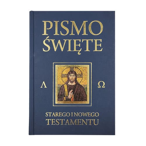 Ekskluzywna edycja Pisma Świętego Starego i Nowego Testamentu w twardej, płóciennej oprawie w kolorze granatowym ze złoceniami.