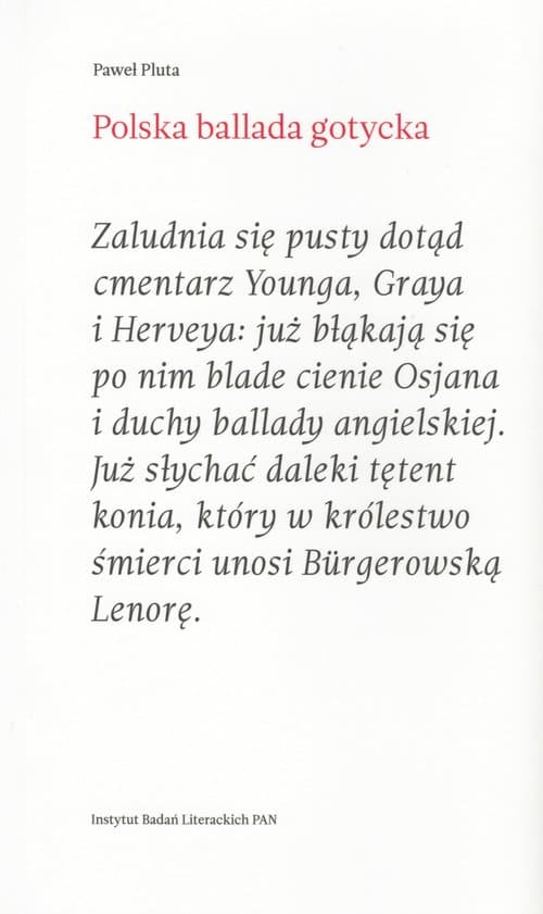 Oczywiste są kłopoty z ustaleniem wyznaczników (czy raczej cech gatunkowych) utworów branych pod uwagę jako współtworzące zbiór [...] „ballad gotyckich”. Autor - szczęśliwie! - nie podejmuje próby wyznaczenia gatunkowych wzorców, lecz przeciwnie: swobodnie poza tego rodzaju praktykę wykracza, jakby tworzył model szerszy, w którym uzupełniają się różne wątki, np. gotycyzm i osjanizm; a przede wszystkim - tropi cele i metody istnienia topiki „gotyckiej” w polskiej literaturze przełomu wieków XVIII i XIX. Z recenzji prof. dr hab. Aliny Kowalczykowej