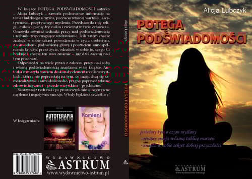W książce POTĘGA PODŚWIADOMOŚCI autorka – Alicja Lubczyk - zawarła podstawowe informacje na temat ludzkiego umysłu, poczucia własnej wartości, asertywności, pozytywnego myślenia. Przedstawiła rolę religii, miłości, pieniędzy, roślin i zwierząt w życiu człowieka. Omówiła również techniki pracy nad podświadomością i techniki wspomagające uzdrawianie. Jeśli zatem chcesz znaleźć w sobie sekret powodzenia w życiu osobistym, z uśmiechem, podniesioną głową i poczuciem samospełnienia kroczyć przez życie, odnaleźć w sobie to, czego Ci brakuje i chcesz ten stan zmienić - już dziś zacznij nad tym pracować. Odpowiedzi na wiele pytań z zakresu pracy nad sobą i własną podświadomością znajdziesz w tej książce. Autorka stworzyła bowiem doskonały elementarz dla wszystkich, którzy nie poprzestają na tym, co mają, chcą się samorealizować i samodoskonalić, pragną poprawić własne zdrowie fizyczne i - przede wszystkim – psychiczne. Skorzystaj z tych rad i po prostu wyeliminuj negatywne myślenie i negatywne emocje. Wtedy będziesz szczęśliwy!