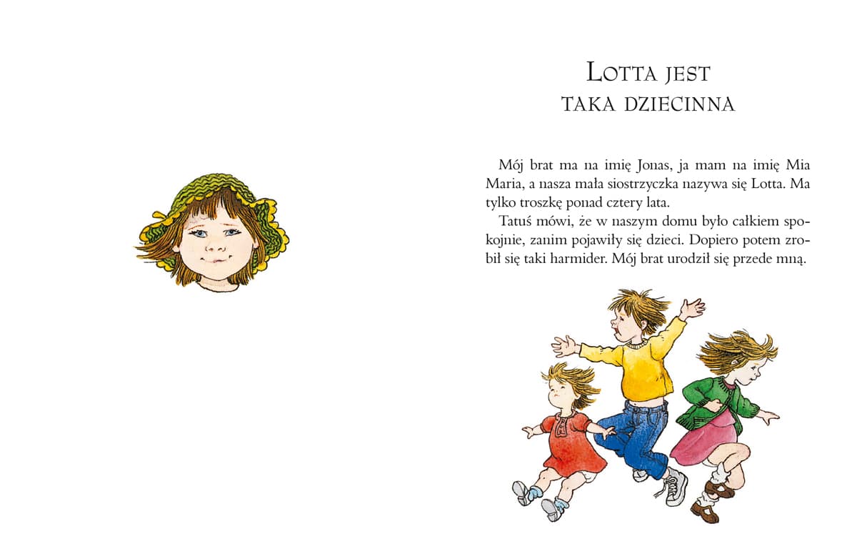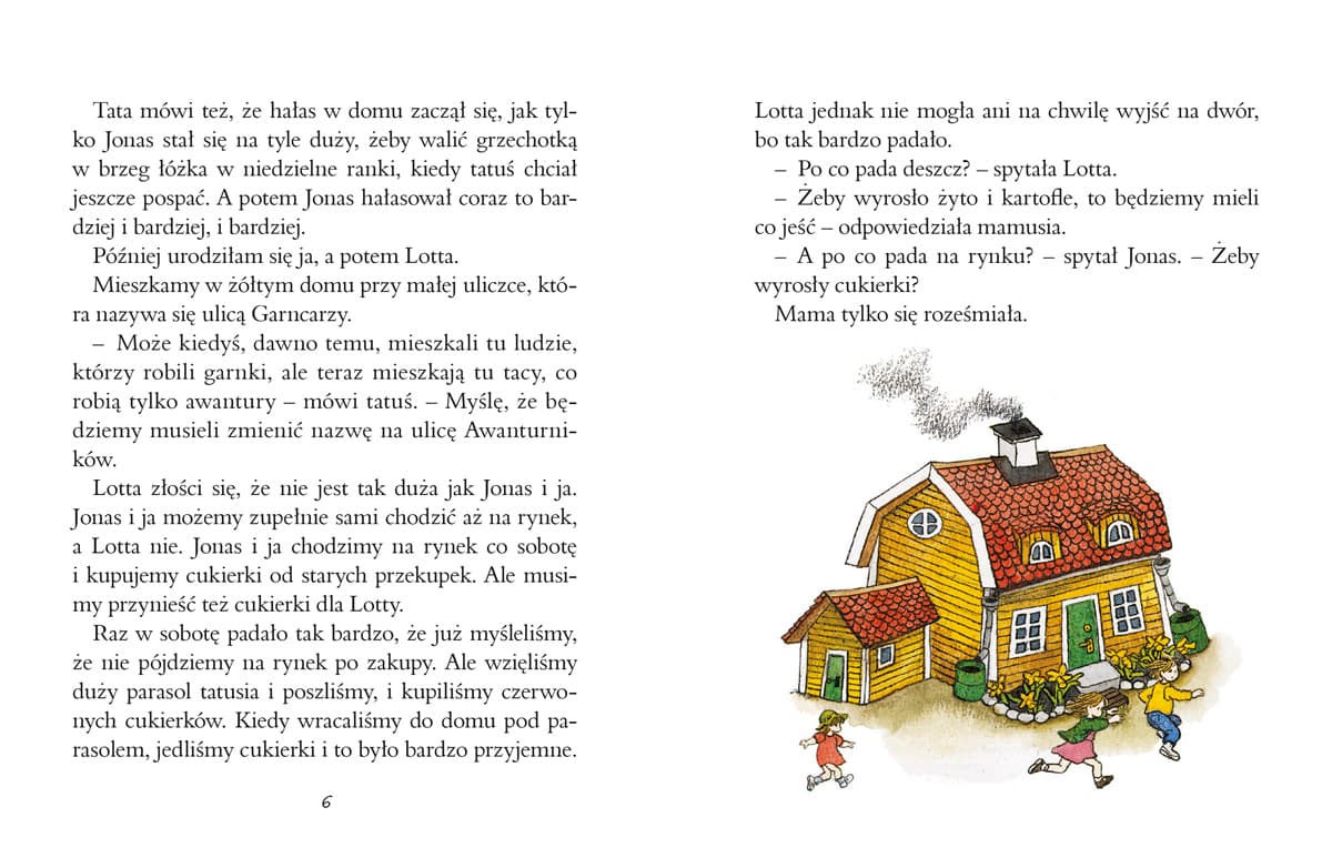 Zbiorowe wydanie dwóch książek o przygodach kapryśnej, upartej i pełnej fantazji Lotty: "Dzieci z ulicy Awanturników" oraz "Lotta z ulicy Awanturników", po raz pierwszy z kolorowymi ilustracjami Ilon Wikland. Tatuś Lotty mówi, że zanim pojawiły się dzieci, w ich domu było całkiem spokojnie. Dopiero potem zrobił się harmider. Rzeczywiście, Lotta, Jonas i Mia-Maria potrafią narozrabiać jak mało kto! Tę bystrą trójkę i ich przygody pokocha czytelnik w każdym wieku. Astrid Lindgren (1907–2001) to jedna z najbardziej znanych i cenionych na całym świecie autorek książek dla dzieci. W jej dorobku znajdziemy ponad 20 powieści oraz zbiorów opowiadań. Jej książki przetłumaczono ze szwedzkiego na wiele języków. Najsłynniejszymi dziełami Lindgren są „Pippi Pończoszanka”, „Bracia Lwie Serce” oraz „Dzieci z Bullerbyn”. Co sprawia, że dzieła Astrid Lindgren są tak wyjątkowe? W odpowiedzi na pytanie, skąd czerpie inspiracje, autorka wyjaśniała: „Nie istnieje żadne inne dziecko, które może mnie zainspirować, poza tym dzieckiem, którym sama niegdyś byłam. Do pisania książek dla dzieci wcale nie jest konieczne posiadanie własnych dzieci. Trzeba tylko samemu kiedyś być dzieckiem. I mniej więcej pamiętać, jak to było”. Ilon Wikland – szwedzka artystka i ilustratorka znana głównie z prac do książek Astrid Lindgren, . „Dzieci z Bullerbyn”, „Braci Lwie Serce” czy „Lotty z ulicy Awanturników”. Urodziła się w 1930 roku w Estonii, ale od 14 roku życia mieszkała w Szwecji, gdzie uciekła przed sowiecką okupacją. Astrid Lindgren poznała w 1953 roku w szwedzkim wydawnictwie Rabén ' Sjögren, w którym ta pracowała jako redaktorka zajmująca się literaturą dziecięcą. Powyższy opis pochodzi od wydawcy.Szczegółowe informacje na temat książki Przygody dzieci z ulicy Awanturników