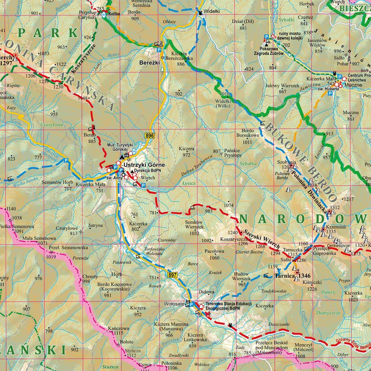 - prawdziwą, turystyczną mapę Bieszczad, okolic Jeziora Solińskiego oraz Bieszczadzkiego Parku Narodowego w skali 1:75 000,