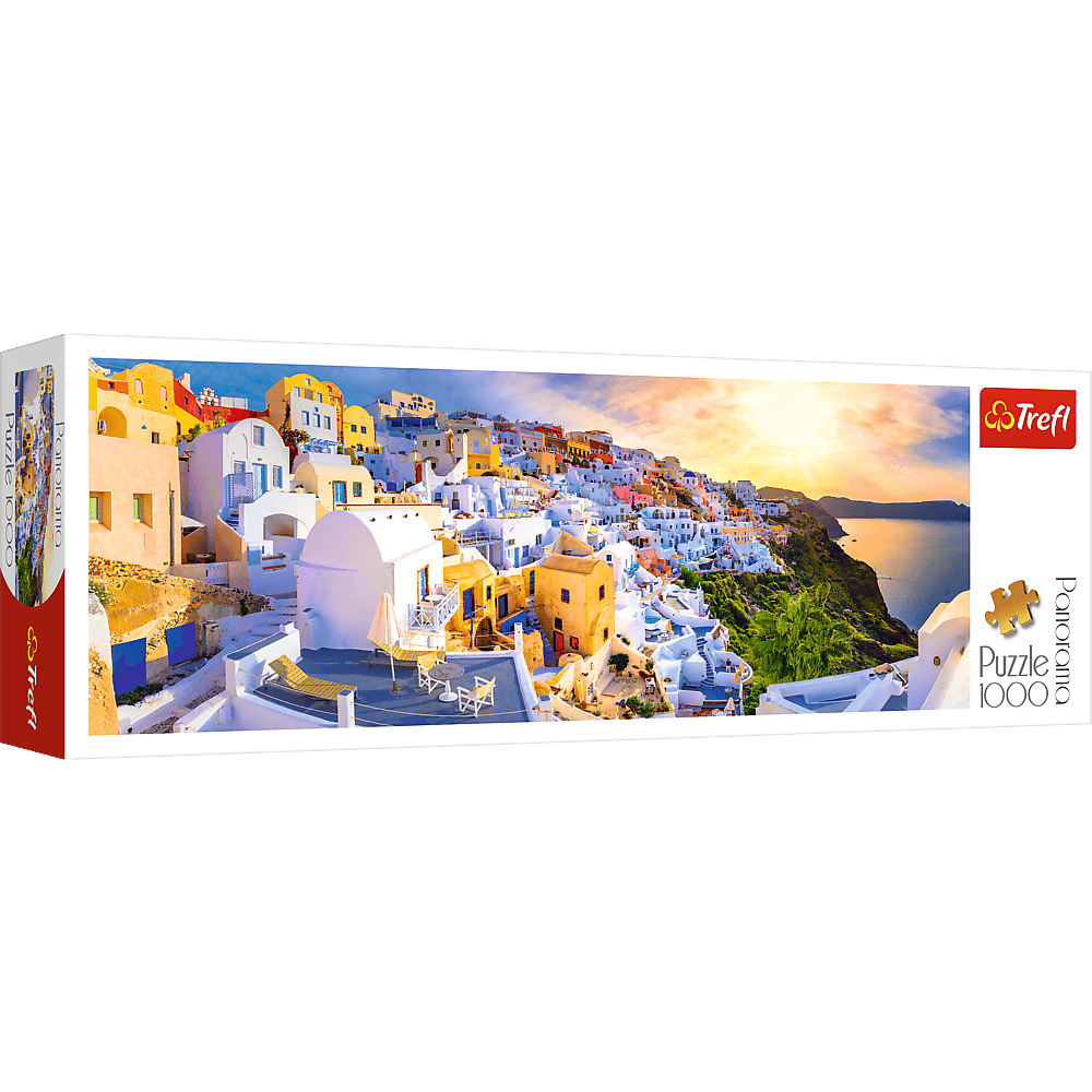 Zachód słońca na Santorini, Grecja to puzzle panoramiczne składające się z 1000 elementów, zaprojektowane specjalnie z myślą o fanach greckich widoków.