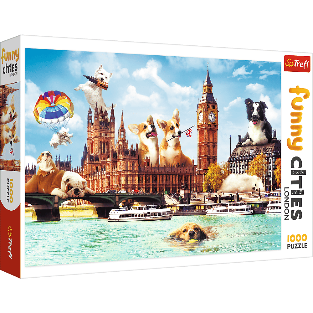 Psy w Londynie to puzzle z serii Funny Cities składające się z 1000 elementów przedstawiające zabawny widok na jedno z bardziej znanych, włoskich miast, zatopione w słodyczach.