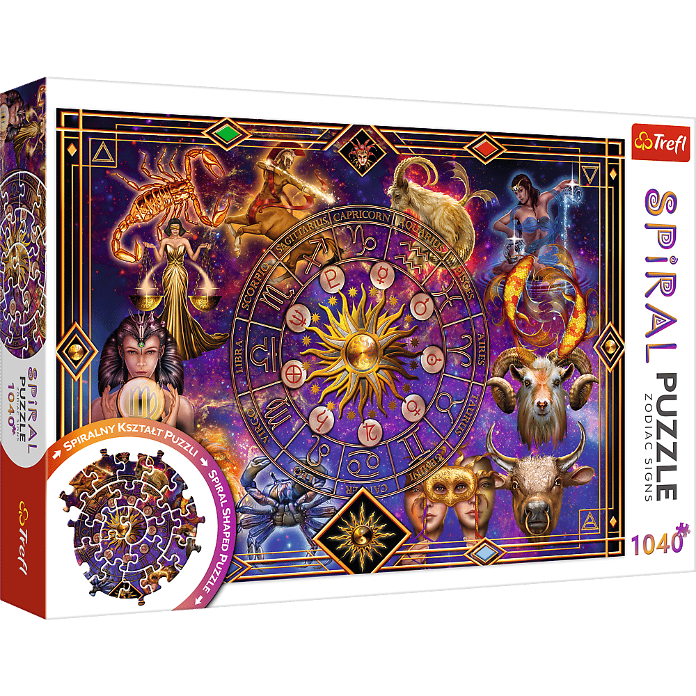 Spiral Puzzle to seria zakręconych obrazów, których elementy po ułożeniu tworzą spiralny kształt. Wskocz w wir dobrej zabawy. Podejmij wyzwanie i wkręć się w układanie! 1040 elementowe puzzle przedstawiają symbole znaków zodiaku. Po ułożeniu powstanie obrazek o wymiarach 683x480 mm.