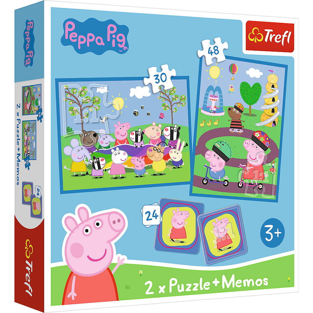 Puzzle 2w1 + memos Radosne chwile Świnka Peppa Trefl. Puzzle 2w1 + memos składają się z 2 niezależnych układanek oraz gry memo z 24 kaflami. Puzzle są idealnie dopasowane do wieku dziecka.