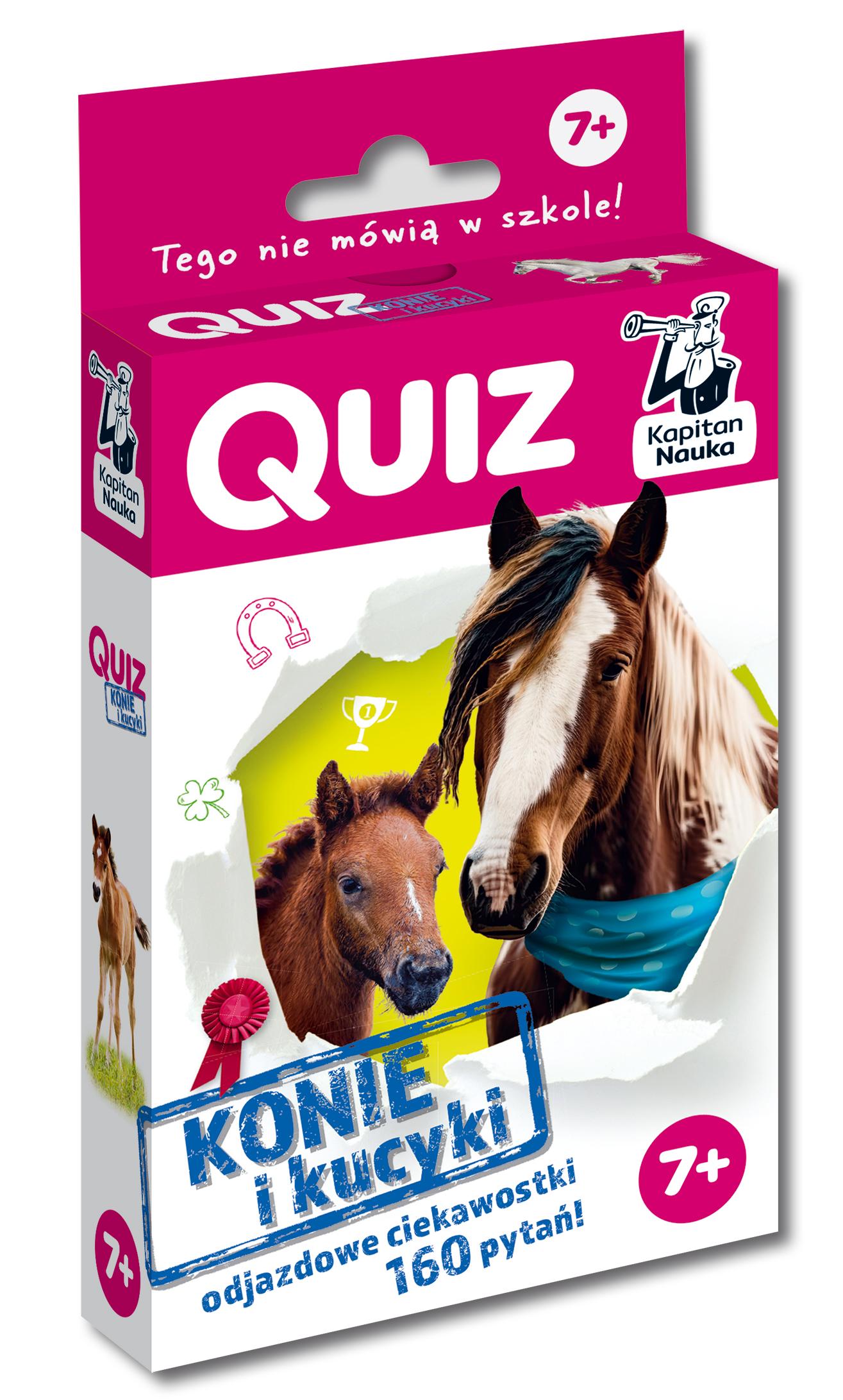 Poznaj odjazdowe ciekawostki dotyczące jazdy konnej, ras koni i kucyków, a także ich zwyczajów i ulubionych przysmaków – tego nie mówią w szkole! I odpowiedz na 160 zaskakujących pytań quizowych – sprawdź swoją wiedzę i zagnij innych. Quiz Konie i kucyki to początek wspaniałej przygody w siodle. Miłośnicy tych szlachetnych stworzeń dowiedzą się, jak zachowywać się w stajni i dbać o konia, od czego zacząć naukę jazdy oraz w jakich dyscyplinach sportowych można startować. Poznajcie quiz Konie i kucyki, a dowiecie się: Czy konie mają humory? Która część ciała to koronka? Kto jest najważniejszy w końskim stadzie? Czy konie lubią słodycze? Które konie są najszybsze na świecie? Kolorowe zdjęcia zachęcają do samodzielnego czytania. Dzięki poręcznemu kieszonkowemu formatowi quiz można zabrać ze sobą wszędzie – na spacer, do parku czy w podróż! Seria QUIZ nie tylko dla nerdów! ciekawie o zwierzętach, kotach, psach, koniach, kucykach, astronomii i Polsce quizy z odpowiedziami kolorowe zdjęcia i ilustracje poręczny format – mieści się w kieszeni! atrakcyjna rozrywka