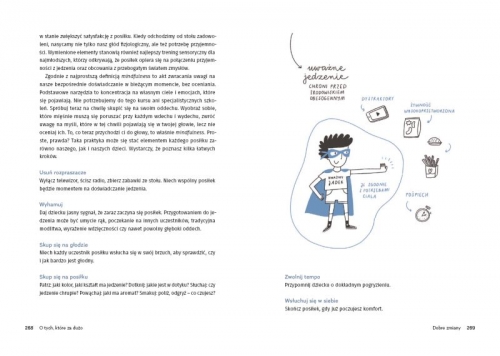 O AUTORKACH: Marta Kostka – z wykształcenia dietetyczka i technolożka żywności. Z zamiłowania niestrudzona i dociekliwa badaczka tematyki żywienia dzieci. Snute przez nią opowieści są po brzegi wypełnione wiedzą, ale nie brakuje w nich też empatii i czułego zrozumienia zarówno dla dziecięcych apetytów, jak i codziennych rodzicielskich bolączek. Promuje holistyczne, oparte na relacji podejście do żywienia. Obala mity, poszerza horyzonty i edukuje poprzez wzbudzanie w innych pasji do jedzenia. W wolnym czasie testuje nowe przepisy na kiszonki i wraz z mężem oraz synem przemierza Polskę na rowerze. Zuzanna Wędołowska – dietetyczka i psycholożka. Zaraża spokojem i zaufaniem do tego, że istnieje dziecięca potrzeba dobrego odżywiania się. Przychodzi ze wsparciem tam, gdzie rodzice zaczynają wątpić, czy potrafią i są w stanie dobrze karmić swoje dzieci. Tematyką żywienia dzieci zaczęła się interesować w pierwszych latach pracy z pacjentami z zaburzeniami odżywiania i nadwagą – to wtedy zrozumiała, jak ważna jest relacja z jedzeniem, która zaczyna się kształtować już w dzieciństwie. Uczy pozytywnego patrzenia na posiłki, jako na coś, co niesie radość, odżywia i pozwala doświadczać świata. Prowadzi stronę internetową „Szpinak robi bleee”, dzięki której wspiera rodziców w żywieniu dzieci, a także stara się koić lęki dorosłych oraz pokazywać im, jak na jedzenie patrzą ich dzieci. Fragmenty książki: Jakim rodzicem jesteś Na wstępie zadajmy sobie kilka pytań: • Czy reaguję na dziecięce sygnały głodu i sytości? • Czy ustalam jasne i zrozumiałe reguły przy stole? • Czy namawiam dziecko do jedzenia i nagradzam je za zjedzony posiłek? • Czy stosuję presję, aby dziecko zjadło więcej? • Czy z obawy przed głodem dziecka szybko rezygnuję z proponowania mu pokarmów, których jeszcze nie zna lub nie lubi? • Czy pozwalam dziecku jeść, co chce i kiedy chce? • Czy przy stole uwzględniam potrzeby dziecka? • Czy przemycam warzywa lub inne ważne dla mnie produkty w potrawach, tak aby dziecko zjadło je nieświadomie? To nie jest quiz, w którym są dobre czy złe odpowiedzi, ale próba sprawdzenia, w jakim punkcie jesteśmy. Rodzic odpowiedzialny jest za, to, co, kiedy i gdzie zaproponuje do jedzenia, dziecko zaś odpowiada za to, ile i czy w ogóle cokolwiek zje (…). U podstaw zasady podziału odpowiedzialności (…) leży głębokie przekonanie, że najmłodsi mają kompetencje do tego, żeby się właściwie żywić. Że chcą się rozwijać, dobrze jeść i że najlepiej wiedzą (a raczej czują), jak pełne są ich brzuchy. Taki model żywienia, nazywany też modelem zaufania (ang. trust model), kładzie nacisk na zawierzenie dziecięcym apetytom, podkreślając również konieczność porzucenia nadmiernej kontroli nad jedzeniem dzieci, nawet jeśli rodzic odczuwa lęk związany z jakimś aspektem ich żywienia. Bez tego zaufania trudno o zbudowanie harmonijnego podziału zadań między tobą a twoim potomkiem. Rozszerzanie diety Czy jest jakaś ścisła kolejność, której powinniśmy się trzymać przy wprowadzaniu nowych produktów do diety dzieci? Raczej nie. Poza krótką listą pokarmów niebezpiecznych czy niewskazanych w jadłospisie niemowląt rozszerzanie diety możemy rozpocząć praktycznie od każdego dania, warzywa czy owocu, a następne produkty proponować w przypadkowej kolejności. Co ważne – i na co z pewnością powinniśmy zwracać uwagę – to nie zwlekać z podawaniem dzieciom różnych pokarmów. Nadmierna ostrożność i rozwlekanie tego procesu przez robienie dużych przerw między kolejnymi wprowadzonymi produktami działają na naszą niekorzyść. Ruch na co dzień Mówiąc o aktywności fizycznej w odniesieniu do sposobów radzenia sobie z otyłością, najczęściej myślimy o spalaniu kalorii. Ruch jest często traktowany niezwykle instrumentalnie – jako kolejna pozycja do odhaczenia na liście rzeczy do zrobienia, by odchudzić dziecko. Ale aktywność fizyczna to coś więcej niż „trzeba spalić słodycze”. Ona sprawia, że dobrze funkcjonuje nie tylko nasz organizm – układ pokarmowy, serce, płuca, mięśnie i kości – ale też nasza głowa. Zgodnie z dużą metaanalizą badań nad wpływem ruchu na zdrowie dzieci otyłych stwierdzono, że aktywność fizyczna buduje pozytywny obraz ciała, podnosi poczucie własnej wartości i zmniejsza ryzyko depresji (King i in. 2020). Ruch i sport naturalnie odciągają dzieci od myślenia o sobie jedynie w kategoriach wyglądu i przekierowują uwagę na to, jak ciało się porusza, funkcjonuje i co potrafi (Abbott, Barber 2010). Dziecku, które widzi, że ciało nie jest jedynie od wyglądania dobrze, łatwiej jest być zdrowszym i szczęśliwszym. Nie bój się gotowców i fast foodów Nie tylko do tych posiłków, które uważamy za zdrowe, powinniśmy zasiadać wspólnie. Stawiając na środku stołu pizzę czy frytki, pokazujemy, że takie produkty też mogą być elementem dobrej diety. Uczymy dzieci, że nie muszą wstydzić się czy ukrywać przed nami, że to jedzenie im smakuje i sprawia frajdę. Jak zamienić fast food w rodzinny posiłek? Dodaj warzywa lub owoce Na bazie takiego dania możemy też dzieciom pokazać, jak w praktyce wyglądają dobre proporcje. Jeśli na stole pojawia się hamburger, warto rozważyć do niego surówkę. Kiedy serwujemy deser, dorzućmy owoce. Możemy tez zasugerować, że skoro na obiad była pizza, to na kolację zrobimy jakieś lżejsze warzywne danie. Dajmy sobie przyzwolenie na jedzenie wszystkiego – tylko wtedy nie będziemy mieć poczucia winy, które nigdy nie idzie w parze z dobrymi nawykami żywieniowymi. Demonizowanie fast foodów i jedzenia na wynos nie sprawi, że dzieci będą ich unikać.