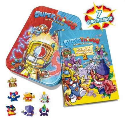 W kolekcjonerskiej, kolorowej metalowej puszce SuperThings znajduje się książka w twardej oprawie zawierająca zabawne komiksy, których bohaterami są Superbohaterowie i Złoczyńcy z Kaboom City. Oprócz tego w zestawie znajduje się 7 losowych figurek SuperThings,  w tym jedna rzadka postać – w kolorze srebrnym lub złotym. Puszka doskonale nadaje się do przechowywania figurek SuperThings!