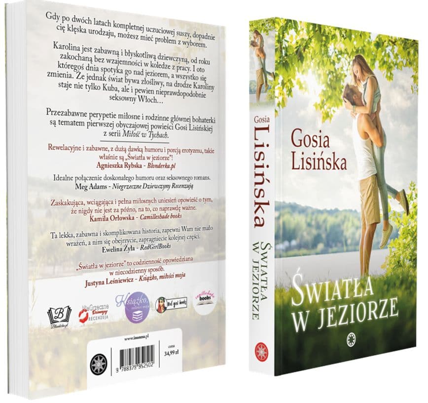 Gdy po dwóch latach kompletnej uczuciowej suszy, dopadnie cię klęska urodzaju, możesz mieć problem z wyborem. Karolina jest zabawną i błyskotliwą dziewczyną, od roku zakochaną bez wzajemności w koledze z pracy. I oto któregoś dnia spotyka go nad jeziorem, a wszystko się zmienia. Że jednak świat bywa złośliwy, na drodze Karoliny staje nie tylko Kuba, ale i pewien nieprawdopodobnie seksowny Włoch… Przezabawne perypetie miłosne i rodzinne głównej bohaterki są tematem pierwszej obyczajowej powieści Gosi Lisińskiej z serii Miłość w Tychach. „Światło w jeziorze” to zabawne perypetie miłosne przebojowej i pewnej siebie Karoliny Wójcik, która po kilku latach samotności, z dnia na dzień staje przed trudnym wyborem… Ta lekka, zabawna i skomplikowana historia, zapewni Wam nie mało wrażeń, a nim się obejrzycie, zapragniecie kolejnej części. Ewelina Żyła – RedGirlBooks „Światła w jeziorze” to zabawna i niesamowicie naturalna historia rezolutnej Karoliny, której życie pokazuje, że los miewa dla nas nieraz niecne plany, w szczególności, jeżeli mowa o nieokiełznanym uczuciu, jakim jest miłość. Zaskakująca, wciągająca i pełna miłosnych uniesień opowieść o tym, że nigdy nie jest za późno, na to, co naprawdę ważne. Kamila Orłowska – Camilleshade books Rewelacyjne i zabawne, z dużą dawką humoru i porcją erotyzmu, takie właśnie jest „Światło w jeziorze”! Dawno nie czytałam tak dobrej komedii romantycznej! Trio, piękna Karola, zabójczy Kuba i ponętny Włoch- Rob, skradli moje serce. Agnieszka Rybska – Blonderka.pl Gosia Lisińska stworzyła opowieść, która mogłaby przydarzyć się każdej z nas. Jednocześnie zabawna i życiowa historia o zakrętach życia i przewrotności losu. Pamiętajcie, że kiedy zbyt długo marzymy o miłości, możemy ją dostać w podwójnej dawce — a to doprowadzi do wielu skomplikowanych, acz ciekawych sytuacji. „Światła w jeziorze” to codzienność opowiedziana w niecodzienny sposób. Justyna Leśniewicz – Książko, miłości moja „Światła w jeziorze” to idealne połączenie doskonałego humoru oraz seksownego romansu. Będzie gorąco, zmysłowo i zabawnie. Historia Karoliny pochłonie Was w mgnieniu oka i nie pozwoli odłożyć książki, dopóki nie poznacie zakończenia. To życiowa, ale posypana odrobiną magii powieść, która umili długie zimowe wieczory. Meg Adams – Niegrzeczne Dziewczyny Recenzują Lekka, zabawna, seksowna, po prostu bardzo kobieca książka! „Światła w jeziorze” to powieść, w której każda z nas odnajdzie cząstkę siebie. Ewelina Nawara – myfairybookworld.pl