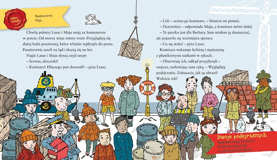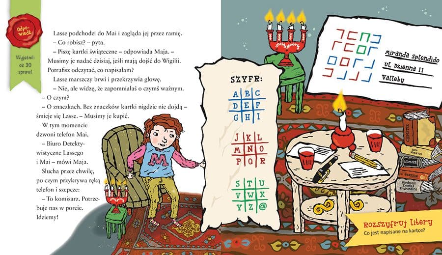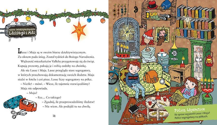 "W recepcji hotelu w Valleby pracuje najbardziej ponury mieszkaniec miasteczka, Rune Andersson. Jedyne, co go interesuje, to zbieranie znaczków. Takie przynajmniej sprawia wrażenie... Tydzień przed Wigilią Lasse i Maja odkrywają przypadkiem pewną tajemnicę z dzieciństwa Runego. Czy uda im się sprawić, że Rune po raz pierwszy od lat spędzi rodzinne święta? Wyjaśnij wraz z Lassem i Mają tajemnicę Runego! Odczytaj zaszyfrowane wiadomości, wypatrz szczegóły, poszperaj na strychu, posegreguj znaczki, posklejaj fotografie, powkręcaj lampki choinkowe i pomóż Runemu cieszyć się świętami jak nigdy! W trakcie CZYTANIA rozwiązuj ZADANIA! Kolejne tytuły serii Biuro Detektywistyczne Lassego i Mai od lat wybierane są książką roku przez szwedzkie Jury Dziecięce, czyli niemal 50 000 głosujących dzieci, a tym samym nie schodzą w Szwecji z list bestsellerów. W Polsce również cieszą się dużą popularnością. Akcja książek rozgrywa się w małym szwedzkim miasteczku Valleby i jego okolicach. Główni bohaterowie, Lasse i Maja, chodzą do tej samej klasy i wspólnie prowadzą małe biuro detektywistyczne. Książki świetnie nadają się dla dzieci, które właśnie zaczynają samodzielnie czytać. Duża czcionka, duża ilość charakterystycznych czarno-białych ilustracji oraz trzymająca w napięciu akcja sprawiają, że nawet najbardziej oporni mali czytelnicy czytają je z wypiekami na twarzach. Do końca 2023 roku w Polsce ukazało się 30 tytułów: „Tajemnica diamentów”, „Tajemnica hotelu”, „Tajemnica cyrku”, „Tajemnica kawiarni”, „Tajemnica mumii”, „Tajemnica kina”, „Tajemnica pociągu”, „Tajemnica gazety”, „Tajemnica szkoły”, „Tajemnica złota”, „Tajemnica zwierząt” , „Tajemnica meczu”, „Tajemnica szafranu”, „Tajemnica biblioteki”, „Tajemnica miłości”, „Tajemnica kempingu”, „Tajemnica galopu”, „Tajemnica szpitala”, „Tajemnica pływalni”, „Tajemnica urodzin”, „Tajemnica wyścigu”, „Tajemnica pożarów”, „Tajemnica więzienia”, „Tajemnica mody”, „Tajemnica zamku”, „Tajemnica srebra”, „Tajemnica filmu”, „Tajemnica detektywa”, „Tajemnica dancingu” i „Tajemnica maskarady”. W roku 2023 ukazał się trzeci tom komiksów: „Skradzione muffinki i inne komiksy”. Poprzednie tomy to: „Sabotaż w punkcie skupu i inne komiksy” oraz „Zielona dywersja i inne komiksy”. Polecamy również: --- „Święta w Valleby. Wielka awaria prądu” – opowiadanie świąteczne z zagadkami --- „Teatr z Lassem i Mają” – cztery sztuki do wystawienia na scenie w domu lub w szkole --- „Wakacje z Lassem i Mają” – książkę złożoną z opowiadania o parze detektywów oraz zabaw i quizów dotyczących serii --- „Brązową księgę”, „Srebrną księgę”, „Złotą księgę” oraz „Diamentową księgę”, które pełne są detektywistycznych łamigłówek, rebusów, zagadek i szyfrów – a wszystko w scenerii miasteczka Valleby i z udziałem bohaterów serii --- „Pamiętnik detektywa”, w którym zbierać można rysopisy i odciski palców kolegów i koleżanek. "Szczegółowe informacje na temat książki Święta w Valleby Niespodziewane prezenty