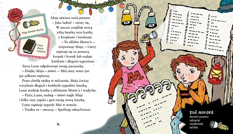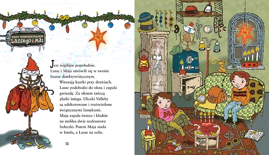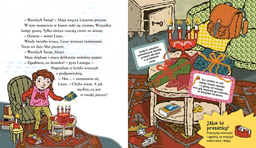 W wigilijny wieczór wydarza się coś nieoczekiwanego: w całym Valleby gaśnie światło i zapada nieprzenikniona ciemność. Jak w takich warunkach świętować Boże Narodzenie? Lasse i Maja próbują dociec, co spowodowało awarię prądu, lecz nie jest to łatwe. Pomóż im rozwiązać zagadkę! Weź czynny udział w śledztwie! Wyjaśnij wraz z Lassem i Mają przyczynę awarii prądu! Odczytaj zaszyfrowane wiadomości, wypatrz szczegóły, znajdź pogubione prezenty, rozpoznaj postaci w ciemnościach, przejdź zawiłe trasy i spróbuj wydedukować, co się wydarzyło! W trakcie CZYTANIA rozwiązuj ZADANIA! Kolejne tytuły serii Biuro Detektywistyczne Lassego i Mai od lat wybierane są książką roku przez szwedzkie Jury Dziecięce, czyli niemal 50 000 głosujących dzieci, a tym samym nie schodzą w Szwecji z list bestsellerów. W Polsce również cieszą się dużą popularnością. Akcja książek rozgrywa się w małym szwedzkim miasteczku Valleby i jego okolicach. Główni bohaterowie, Lasse i Maja, chodzą do tej samej klasy i wspólnie prowadzą małe biuro detektywistyczne. Książki świetnie nadają się dla dzieci, które właśnie zaczynają samodzielnie czytać. Duża czcionka, duża ilość charakterystycznych czarno-białych ilustracji oraz trzymająca w napięciu akcja sprawiają, że nawet najbardziej oporni mali czytelnicy czytają je z wypiekami na twarzach. Do końca 2022 roku w Polsce ukazało się 29 tytułów: „Tajemnica diamentów”, „Tajemnica hotelu”, „Tajemnica cyrku”, „Tajemnica kawiarni”, „Tajemnica mumii”, „Tajemnica kina”, „Tajemnica pociągu”, „Tajemnica gazety”, „Tajemnica szkoły”, „Tajemnica złota”, „Tajemnica zwierząt” , „Tajemnica meczu”, „Tajemnica szafranu” , „Tajemnica biblioteki”, „Tajemnica miłości”, „Tajemnica kempingu”, „Tajemnica galopu”, „Tajemnica szpitala”, „Tajemnica pływalni”, „Tajemnica urodzin”, „Tajemnica wyścigu”, „Tajemnica pożarów”, „Tajemnica więzienia”, „Tajemnica mody”, „Tajemnica zamku”, „Tajemnica srebra”, „Tajemnica filmu”, „Tajemnica detektywa” i „Tajemnica dancingu”. W roku 2021 ukazał się także pierwszy tom komiksów: „Sabotaż w punkcie skupu i inne komiksy”, w 2022 miał premierę tom drugi: „Zielona dywersja i inne komiksy”. Polecamy również: --- „Teatr z Lassem i Mają” – cztery sztuki do wystawienia na scenie w domu lub w szkole --- „Wakacje z Lassem i Mają” – książkę złożoną z opowiadania o parze detektywów oraz zabaw i quizów dotyczących serii --- „Brązową księgę”, „Srebrną księgę”, „Złotą księgę” oraz „Diamentową księgę”, które pełne są detektywistycznych łamigłówek, rebusów, zagadek i szyfrów – a wszystko w scenerii miasteczka Valleby i z udziałem bohaterów serii --- „Pamiętnik detektywa”, w którym zbierać można rysopisy i odciski palców kolegów i koleżanek.Szczegółowe informacje na temat książki Święta w Valleby. Wielka awaria prądu. Biuro Detektywistyczne Lassego i Mai