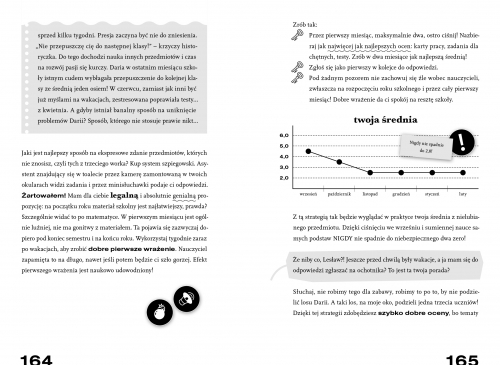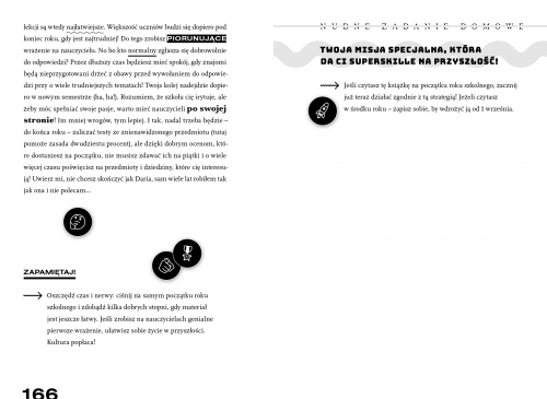 Musisz wiedzieć, że tak jak do poradników podchodzę z dużą dozą sceptycyzmu tak ta pozycja mile mnie zaskoczyła. Napisana przez młodego człowieka, aktywistę i Instagramera walczącego o prawa ucznia, osobę, która wie o czym mówi i o czym pisze.Książka przeznaczona dla młodych czytelników. Napisana lekkim młodzieżowym językiem, nie boję się tego rzec, powinna stać się dla nich lekturą obowiązkową. Młody twórca zawarł w niej bowiem wiele cennych rad jak przetrwać szkołę, ale co istotne, przy akceptacji tego co mamy i co młody człowiek w systemie zmienić nie może, bo o tym decyduje ktoś odgórnie.Każdy rozdział zawiera historyjki z życia na dany temat, opis, w tym liczne odwołania do badań naukowych lub historii sławnych ludzi, którzy odnieśli sukces. Dodatkową literaturę i zadanie, które warto wykonać.Mnie najbardziej zainteresowały tematy zawarte w książce:- jak odróżnić pasje, która może tam przynieść zysk w przyszłości od hobby?- jak znaleźć czas na swoją pasję, będąc uczniem?- dlaczego sen w życiu nastolatka jest ważny i znaleźć na niego czas, gdy spędzasz w szkole 8 godzin?- jak uczyć się skutecznie?- jak dobierać znajomych, którzy ciągną Cię w górę, a nie w dół?- jak mądrze wykorzystać Internet?- jak odzwyczaić się od bezproduktywnego scrolowania kapibar na Facebooku czy Instagramie?I wiele innych interesujących tematów.O wartości tej książki niech świadczy to, że i ja, jako osoba dorosła, wiele z tej lektury wyniosłam dla siebie. Dlatego z czystym sumieniem polecam tę pozycję zarówno młodzieży jak i ich rodzicom. Ja już tę książkę odłożyłam dla mojego synka, ponieważ bardzo bym chciała, żeby ją przeczytał przed rozpoczęciem swojej edukacyjnej kariery.