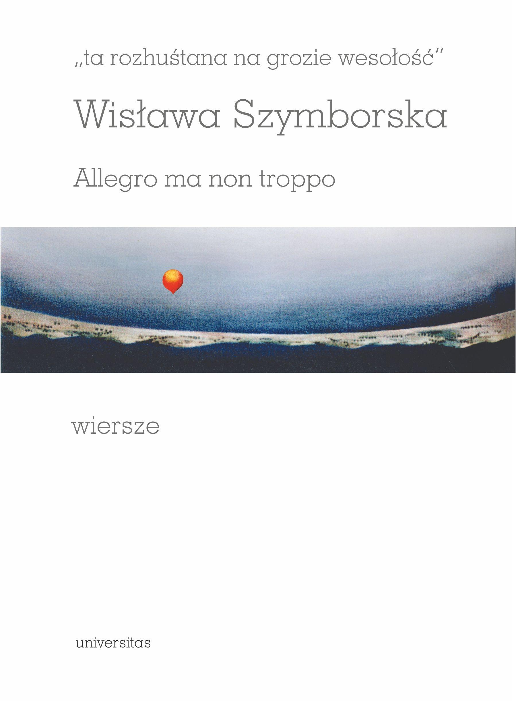 Allegro ma non troppo to formuła muzyczna, którą Wisława Szymborska ujmuje dosłownie: "wesoło, ale nie za bardzo". Zawiera ona istotę jej twórczości, jest odmianą "zachwytu i rozpaczy", które sama poetka uznała za swoje "znaki szczególne". To też jedyny włoski tytuł, jaki spotykamy w jej twórczości - i właśnie we Włoszech jej "rozhuśtana na grozie wesołość" znalazła szczególne echo, rozrastając się z czasem w istny kult. Stąd pomysł, żeby poprzez wybrane włoskie głosy - reżysera filmowego i reżysera teatralnego, muzyka i aktorki, pisarki i pisarza, dwóch polonistów-komparatystów - zaoferować polskim czytelnikom Szymborskiej eks-centryczne - jako że obce - spojrzenie na jej twórczość, w przekonaniu, że przyjrzenie się swojej kulturze w oczach Innego może przynieść w darze ciekawe odkrycia, oraz w duchu samej poetki, która szukała ciągle nowych punktów widzenia, nowych zdumień wobec pozornie znanych zjawisk świata.