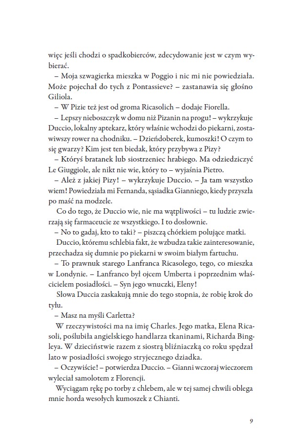 Co bardziej Wam odpowiada: leniwe dni w rytmie la dolce vita czy dynamiczne tempo miejskiej codzienności? „To nie jest kraj dla singli” Felicii Kingsley to włoski romans ogrzany słońcem Toskanii, pełen lekkości, humoru i klimatu, który niemal czuć na skórze. Autorka zabiera czytelnika do malowniczego Belvedere in Chianti, miasteczka, gdzie życie płynie powoli, w rytmie la dolce vita, wśród złocistych winnic oraz aromatu świeżej oliwy. W sercu tej czarującej krainy stoi posiadłość Le Giuggiole z rozległą, malowniczą winnicą, której sercem jest Elisa. Elisa to silna i niezależna kobieta, a przy tym dumna niczym Elizabeth Bennet. Przyzwyczajona do samodzielności i podejmowania własnych decyzji jest przekonana, że nie potrzebuje nikogo, by czuć się spełniona. Jej świat opiera się na pracy, odpowiedzialności i wewnętrznej sile, a serce zdaje się mieć pod kontrolą, przynajmniej do czasu, gdy przeszłość puka do jej drzwi. Michael przywodzi na myśl pana Darcy’ego: zdystansowany, powściągliwy, momentami chłodny w obyciu, a przez to łatwy do błędnej oceny. Skrywa emocje za maską opanowania i dumy, co tylko potęguje napięcie między nim a Elisą. Podobnie jak Darcy sprawia wrażenie człowieka pewnego siebie i nieco wyniosłego, lecz pod tą pozorną surowością kryje się wrażliwość, lojalność i uczucie głębsze, niż początkowo można przypuszczać. Delikatnym niedosytem może być relacja głównych bohaterów, która momentami wydaje się nieco zbyt stonowana jak na włoski romans w sercu Toskanii. W tej pełnej słońca i temperamentu scenerii aż chciałoby się odrobiny więcej iskier, namiętności i spontanicznych porywów serca. Uczucie między Elisą a Michaelem rozwija się subtelnie i z wyczuciem, chwilami bardziej powściągliwie niż ognisto. Przy tak zmysłowym tle naturalnie rodzi się apetyt na szczyptę większej pikantności i emocji, które choć na moment wymknęłyby się spod kontroli. Podobnie jak w „Dumie i uprzedzeniu”, w „To nie jest kraj dla singli” Felicii Kingsley życie toczy się w społeczności, w której każdy zna każdego, a małe intrygi i plotki potrafią rozgrzać atmosferę równie mocno jak najgorętsze włoskie słońce. Belvedere in Chianti staje się sceną subtelnych napięć i nieśmiałych flirtów, gdzie spotkania przy winie czy rodzinnych kolacjach przypominają salonowe przyjęcia, na których największym trofeum bywa… upolowanie męża. Autorka mistrzowsko oddaje atmosferę Toskanii. Czytelnik niemal czuje zapach dojrzałych winogron, oliwy z oliwek i smak domowej pappardelle w aromatycznym sosie z ziołami. Słońce, winnice, brukowane uliczki i wieczorne spotkania przy winie tworzą prawdziwą podróż dla zmysłów, a humor, lokalne intrygi i barwne postacie wprowadzają lekki, pogodny nastrój. Największą siłą „To nie jest kraj dla singli” jest niezwykły klimat Włoch. Felicia Kingsley z lekkością opisuje malownicze pola, urokliwe uliczki Belvedere in Chianti i codzienne rytuały mieszkańców, tak że każdy fragment pachnie świeżym pieczywem i oliwą z oliwek. Ta sielska, włoska atmosfera sprawia, że powieść staje się pełną emocji podróżą dla zmysłów i serca, w której każdy szczegół, od smaków lokalnych potraw po drobne gesty ludzi, zachwyca i wciąga. Podsumowując, bawiłam się świetnie. Humor i zabawne sceny wywołują szczery uśmiech, a zmysłowe opisy Toskanii sprawiają, że niemal czuje się słońce, zapach wina i smak domowego makaronu. Czytając, marzyłam o kieliszku wina na tarasie, ciepłym wieczorze i rozmowach do późna. Ta książka pozwala zwolnić, rozmarzyć się i choć na chwilę poczuć prawdziwą la dolce vita.