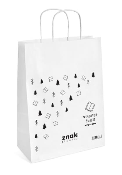 Okazjonalna torba papierowa na książki. Torba w kolorze białym, z mocnym, skręcanym uchwytem. Napis na torbie: WESOŁYCH ŚWIĄT Wymiary: 240x320 mm