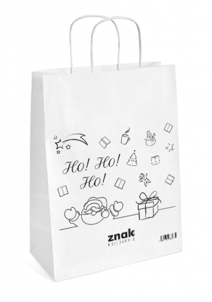 Okazjonalna torba papierowa na książki. Torba w kolorze białym, z mocnym, skręcanym uchwytem. Napis na torbie: Ho! Ho! Ho! Wymiary: 240x320 mm