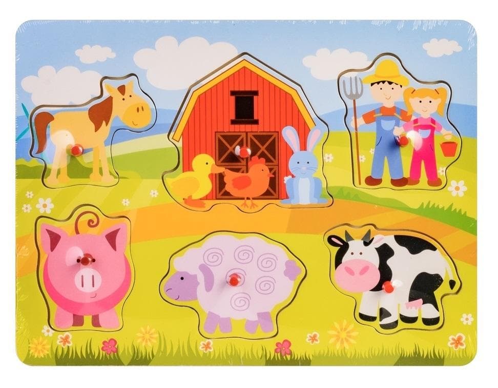 Edukacyjna układanka drewniana dla dzieci przedstawiająca zwierzątka, które można spotkać na farmie, rozwija spostrzegawczość i koordynację wzrokowo-ruchową.